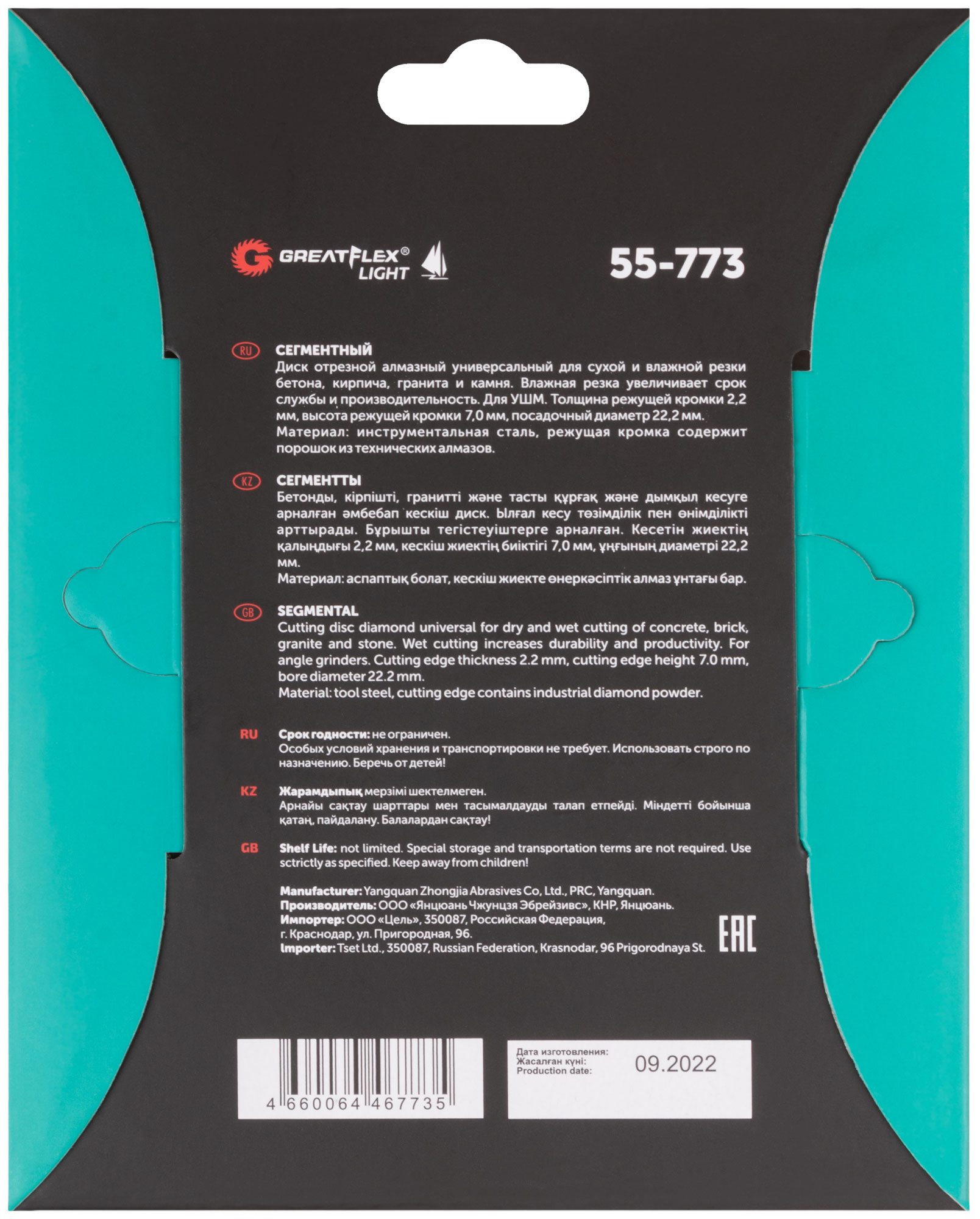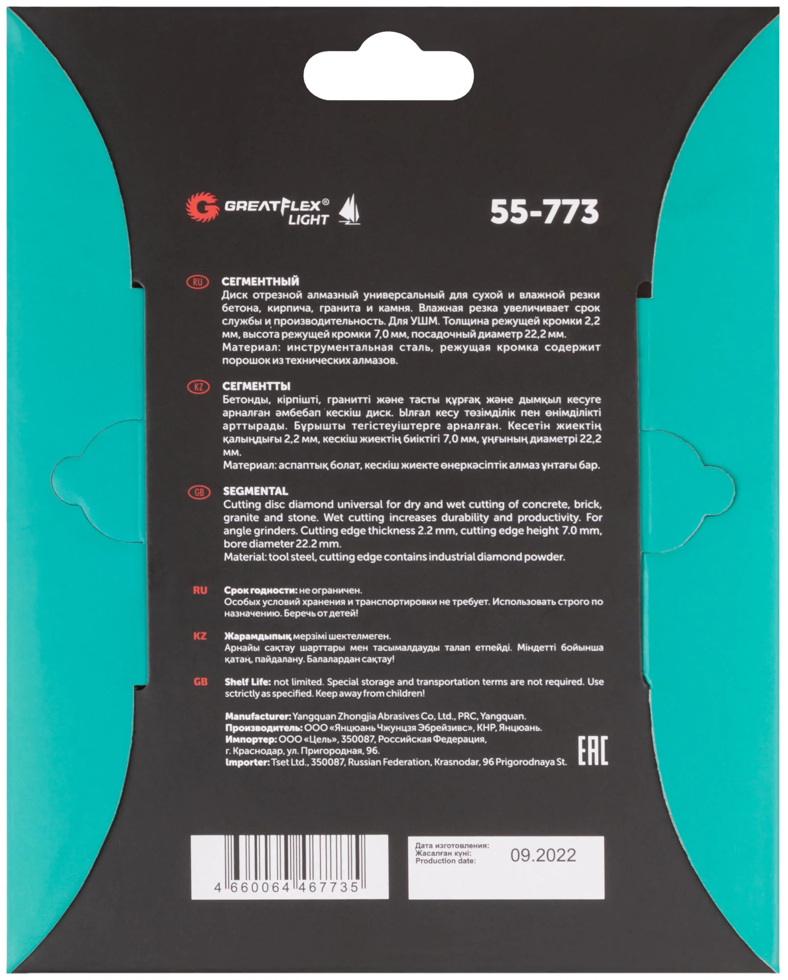 Диск отрезной алмазный GreatFlex Light, размером 150 x 2.2 x 7.0 x 22.2 мм, станет незаменимым помощником при резке бетона, кирпича, гранита и камня. Этот универсальный инструмент позволяет проводить работы как в сухих, так и во влажных условиях, обеспечивая чистый и ровный рез.