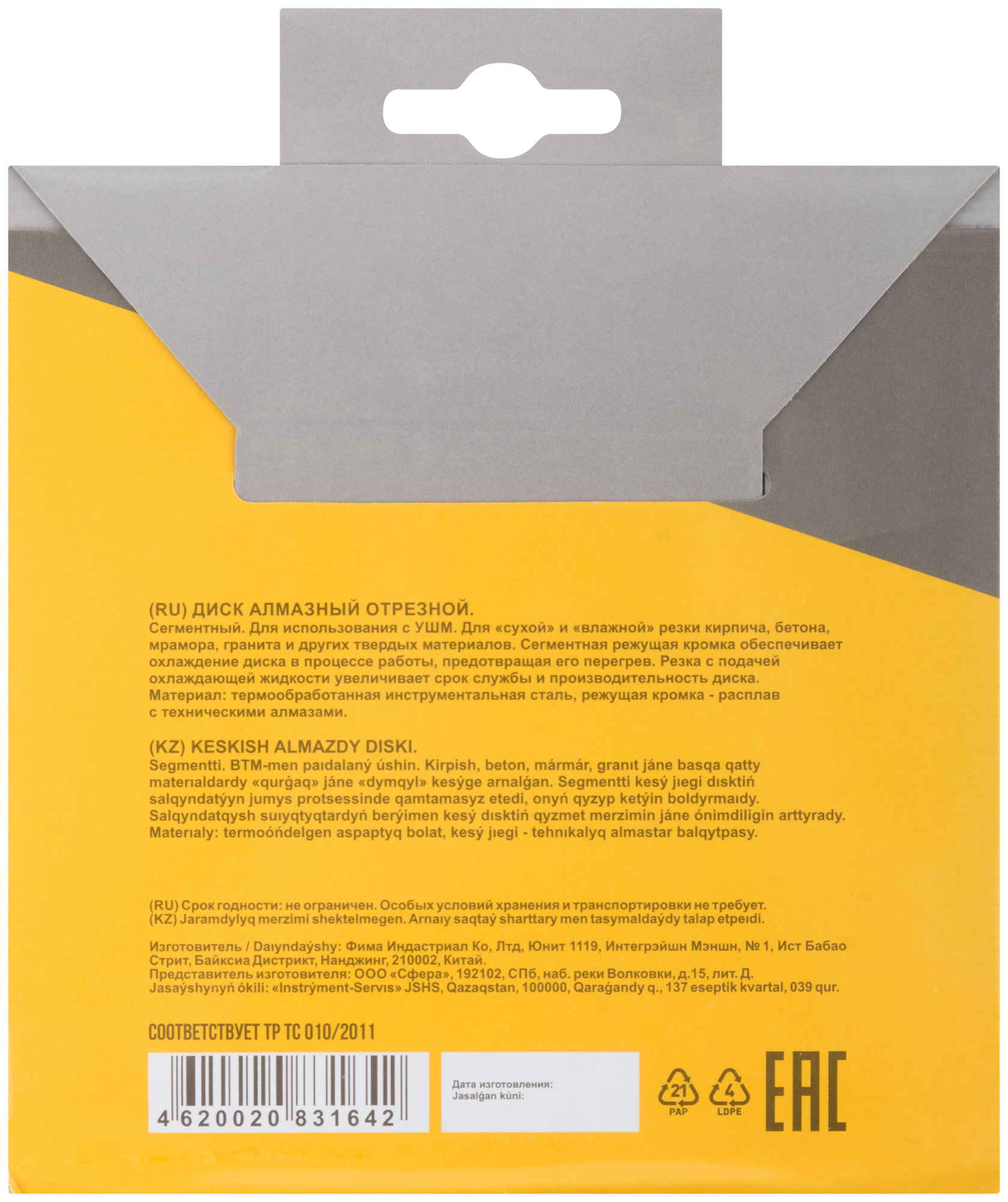 Сегментная режущая кромка обеспечивает оптимальное охлаждение, предотвращая перегрев диска при интенсивной работе. Изготовленный из инструментальной стали с алмазной кромкой, он гарантирует долговечность и эффективность.