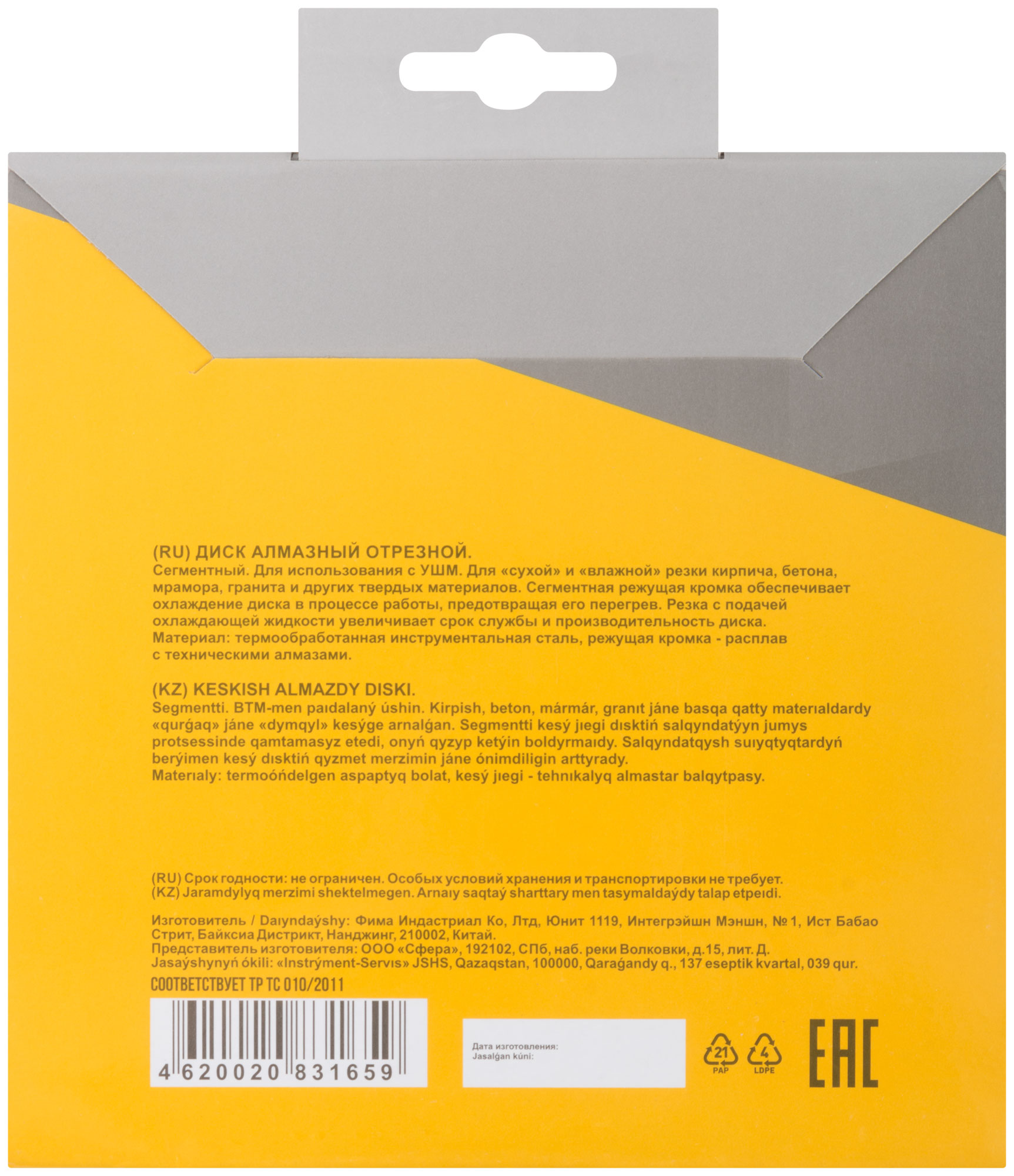 Конструкция диска предусматривает сегментную режущую кромку, которая эффективно охлаждает инструмент в процессе работы, предотвращая перегрев. Изготовленный из инструментальной стали и расплава с техническими алмазами, он обеспечивает долговечность и надежность.