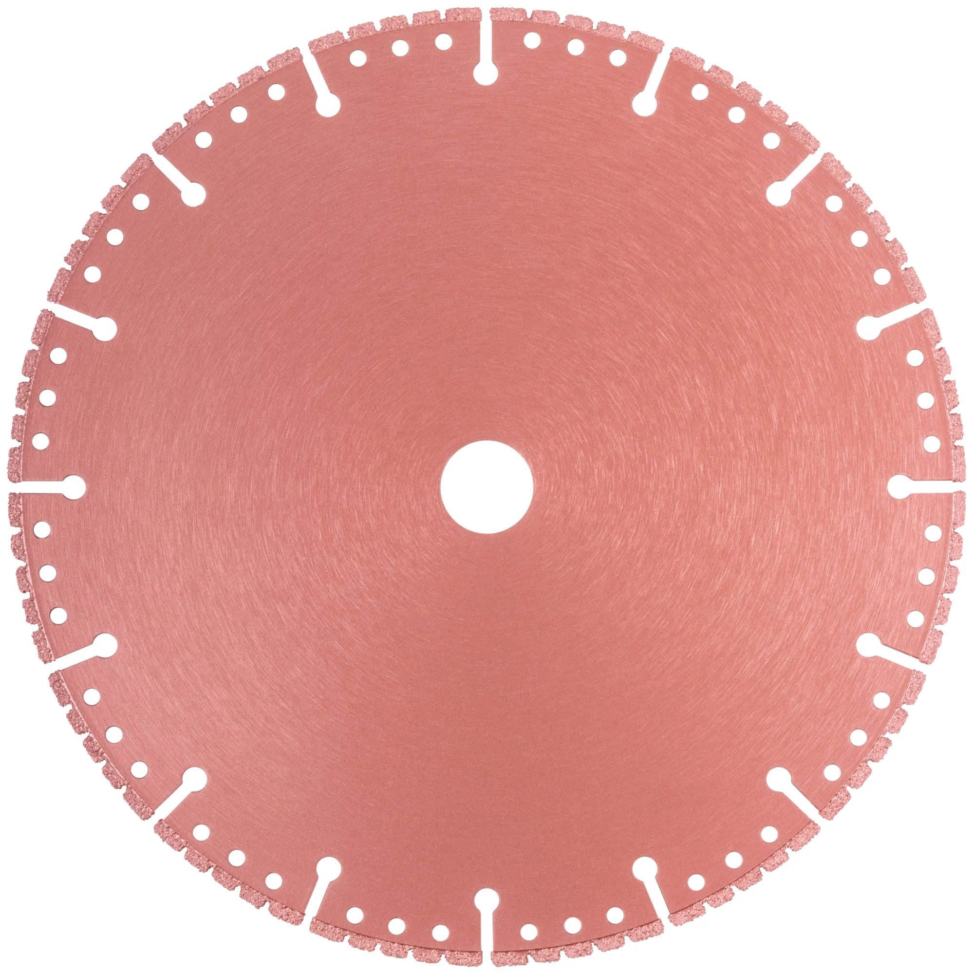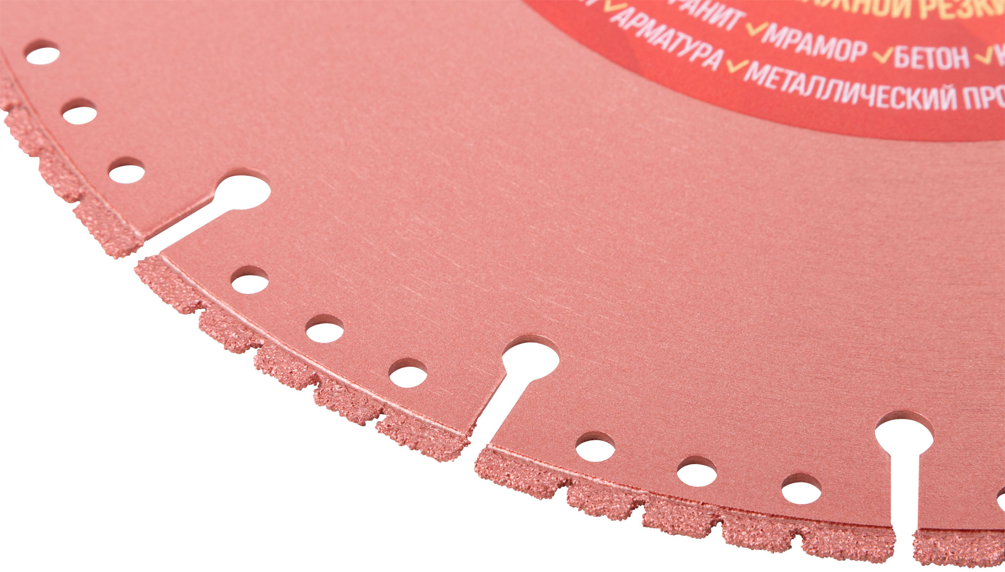 Диск изготовлен из высокоуглеродистой термообработанной инструментальной стали. Его режущая кромка содержит порошок из технических алмазов, что обеспечивает максимальную эффективность при резке различных материалов, включая бетон, кирпич, гранит и мрамор.