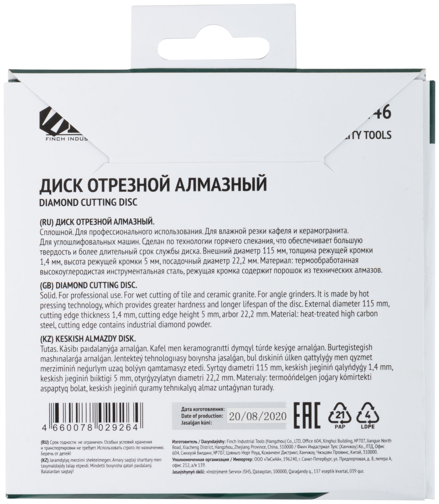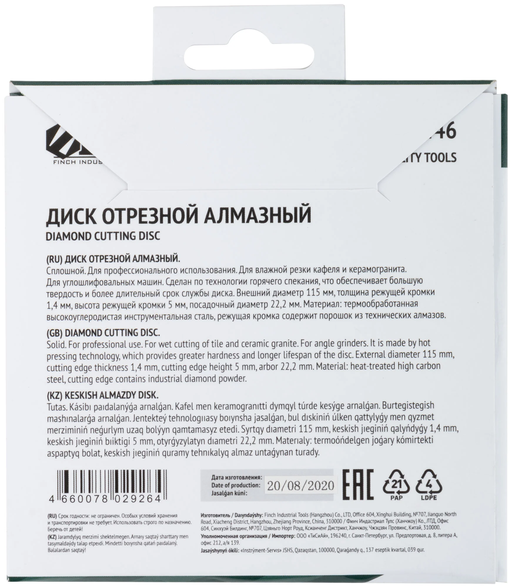 Изготовлен по технологии горячего спекания, диск обладает повышенной износостойкостью. Толщина кромки составляет 1,4 мм, что обеспечивает тонкий и аккуратный рез. Материал диска включает термообработанную высокоуглеродистую инструментальную сталь с техническими алмазами на режущей кромке.