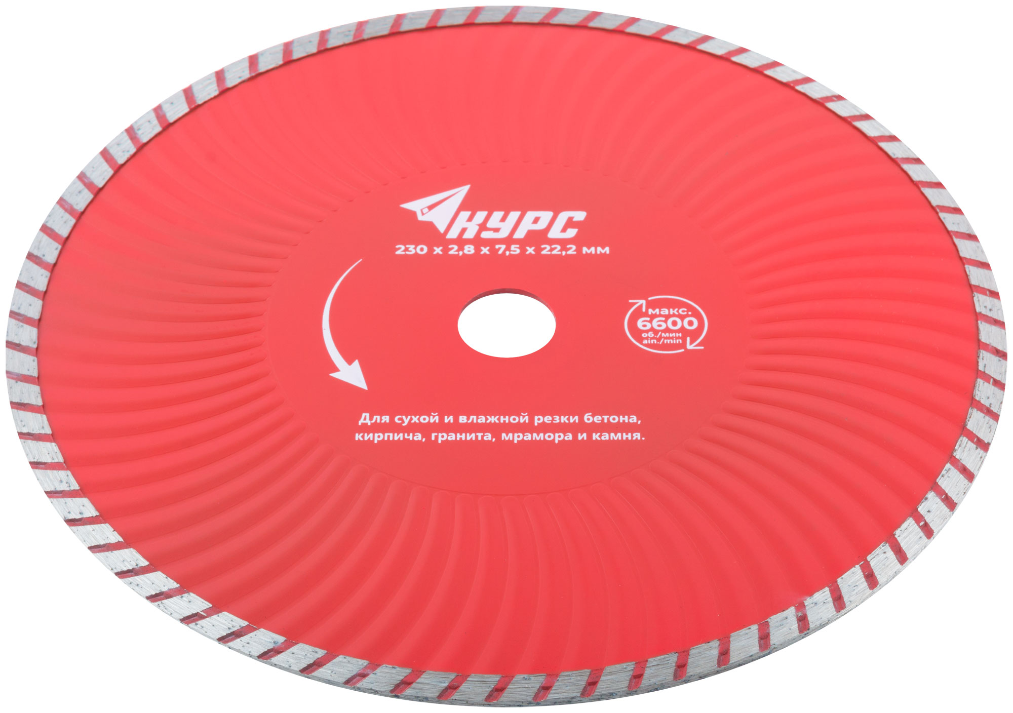Алмазный диск "Турбо-волна" от бренда КУРС имеет усиленную конструкцию, что обеспечивает долговечность и надежность. Высота алмазной режущей кромки составляет 7 мм, благодаря чему диск сохраняет эффективность на протяжении длительного использования.