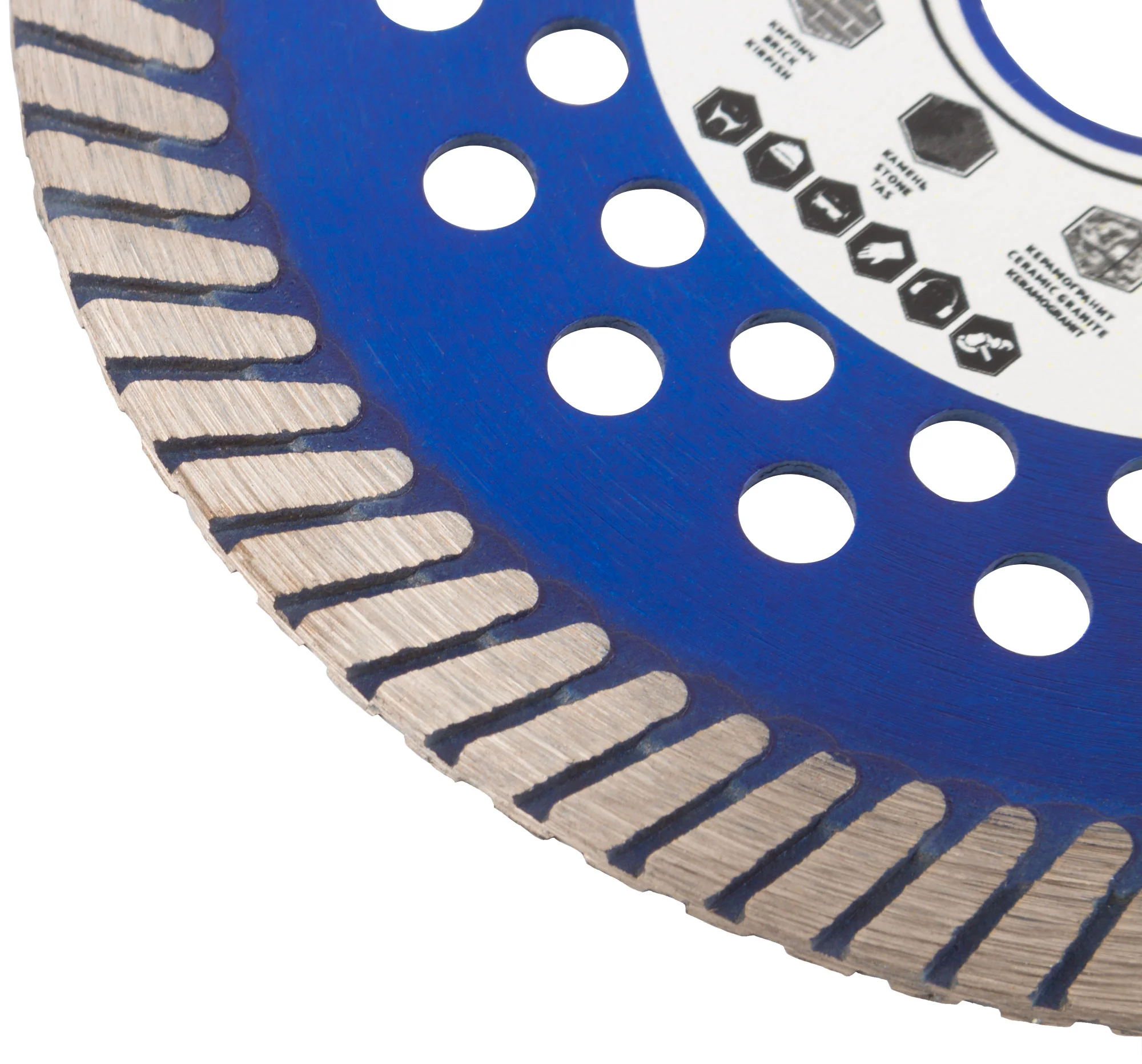 Диск изготовлен из высокоуглеродистой инструментальной стали с режущей кромкой, содержащей порошок из технических алмазов. Высота алмазной режущей кромки составляет 10 мм, что позволяет обеспечивать длительный срок службы и высокую точность резки. Посадочный диаметр 22,2 мм делает его совместимым с большинством углошлифовальных машин.