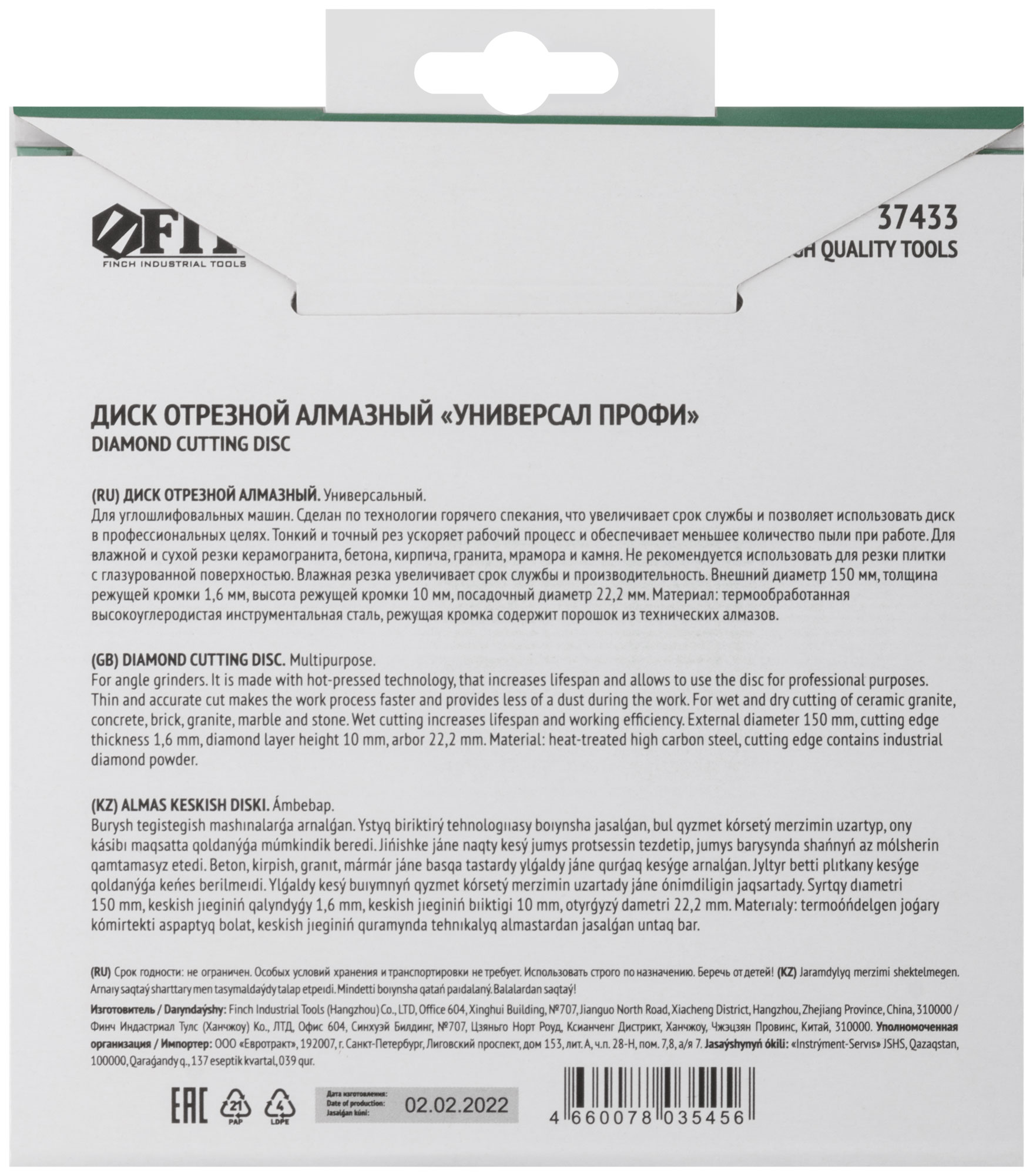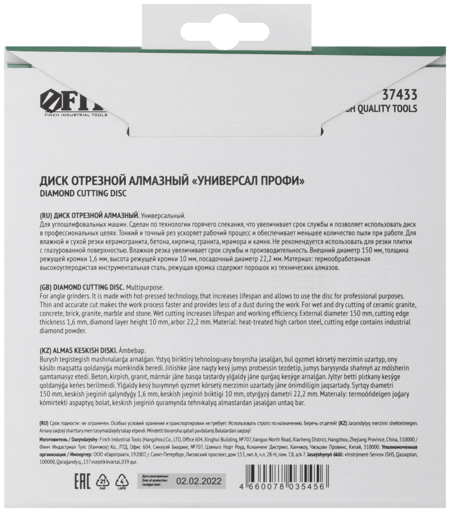 Диск изготовлен из инструментальной стали с добавлением технических алмазов на режущей кромке. Высота алмазной кромки составляет 10 мм, что обеспечивает долговечность и производительность в любых условиях. Посадочный диаметр 22,2 мм позволяет использовать диск с большинством стандартных угловых шлифовальных машин.