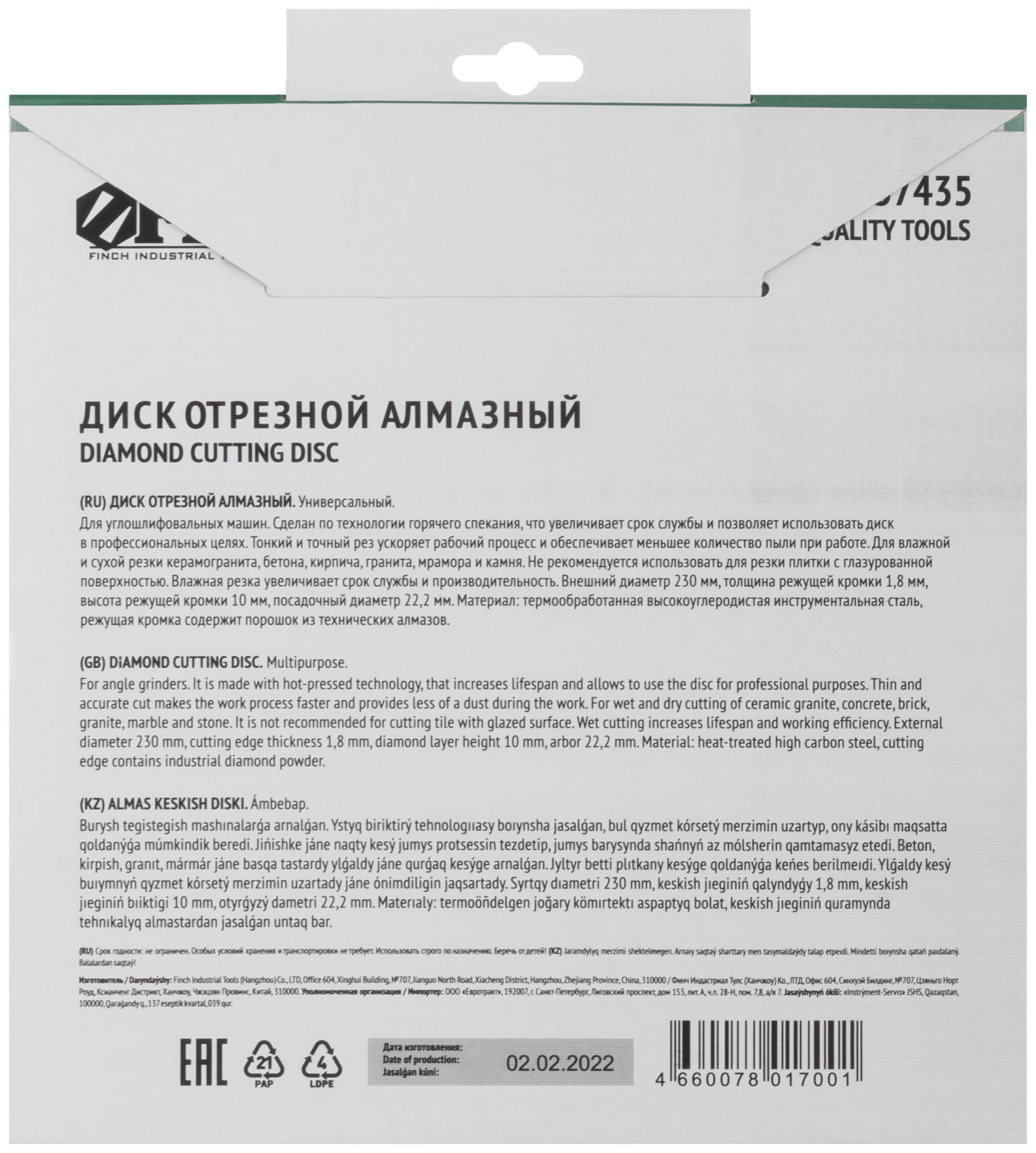 Диск изготовлен по технологии горячего спекания, что обеспечивает надежность и долговечность. Высота алмазной кромки 10 мм позволяет выполнять точные и чистые резы, а посадочный диаметр 22,2 мм подходит для большинства угловых шлифмашин.