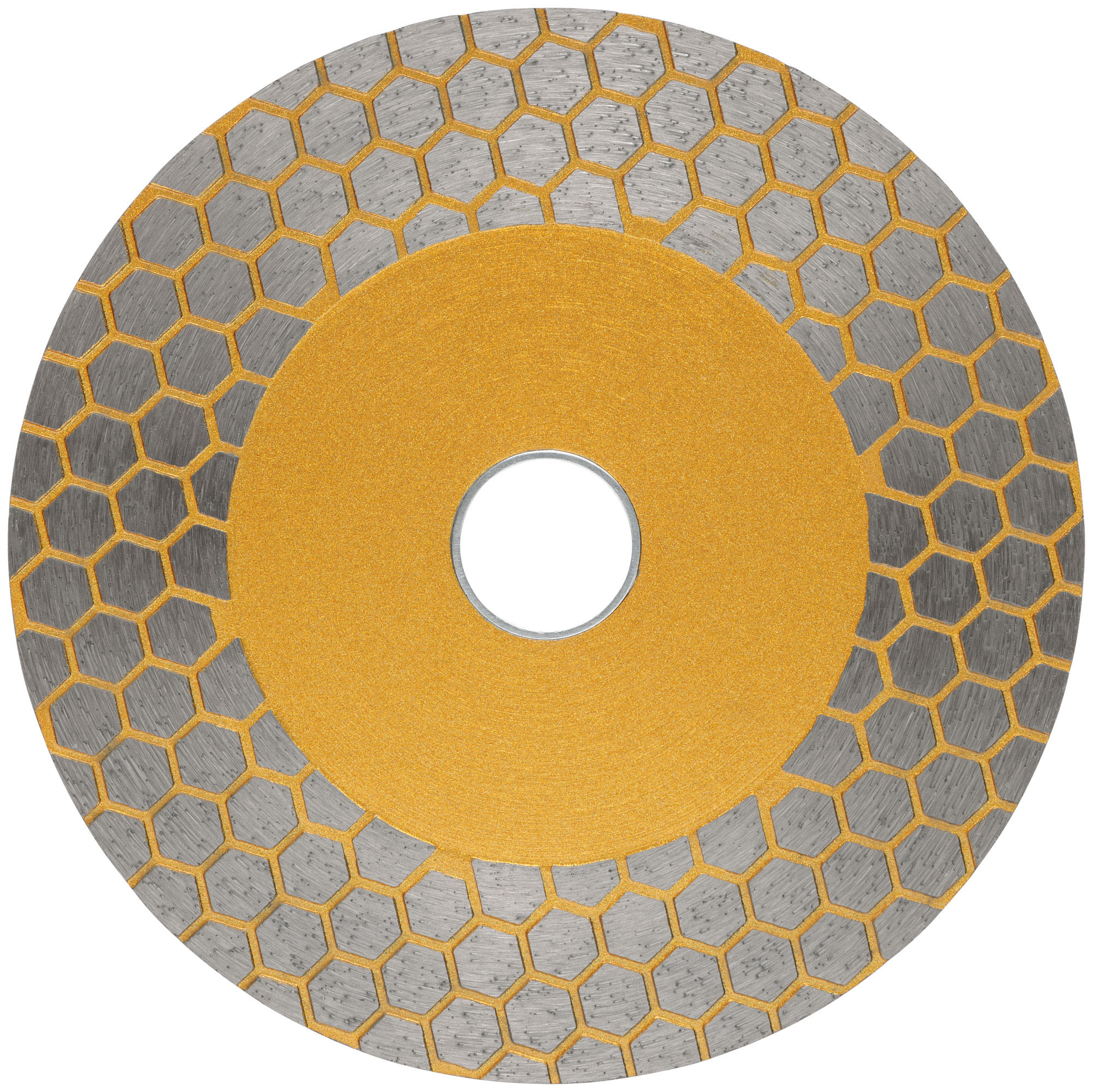 Изготовлен из инструментальной стали с использованием технологии горячего спекания, диск обладает высотой алмазной режущей кромки 25 мм. Посадочный диаметр составляет 22,2 мм, что делает его совместимым со многими угловыми шлифовальными машинами. Инновационная конструкция позволяет не только резать, но и шлифовать камень и керамогранит.