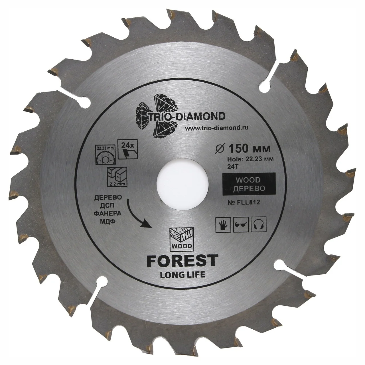 Пильный диск TRIO-DIAMOND модели FLL812 оптимален для точной и быстрой резки древесины, фанеры, ДСП и МДФ. Идеально подходит для использования на строительных площадках или в мастерских, когда нужна качественная и быстрая обработка материала.