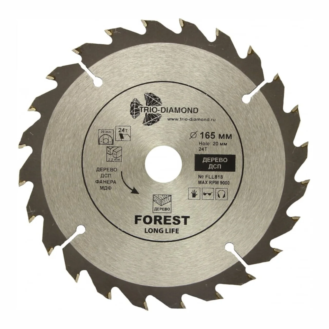 Пильный диск TRIO-DIAMOND из серии Forest Long Life отличается высокой износостойкостью и долговечностью, позволяя работать при максимальных оборотах до 9 000 RPM.