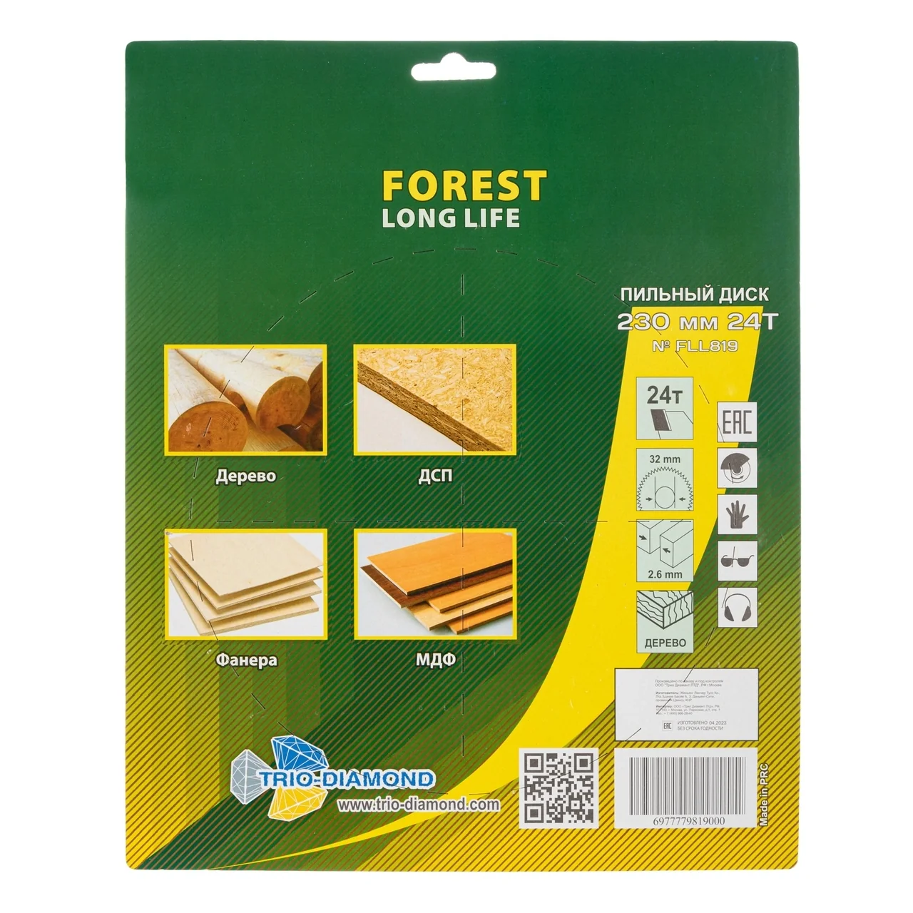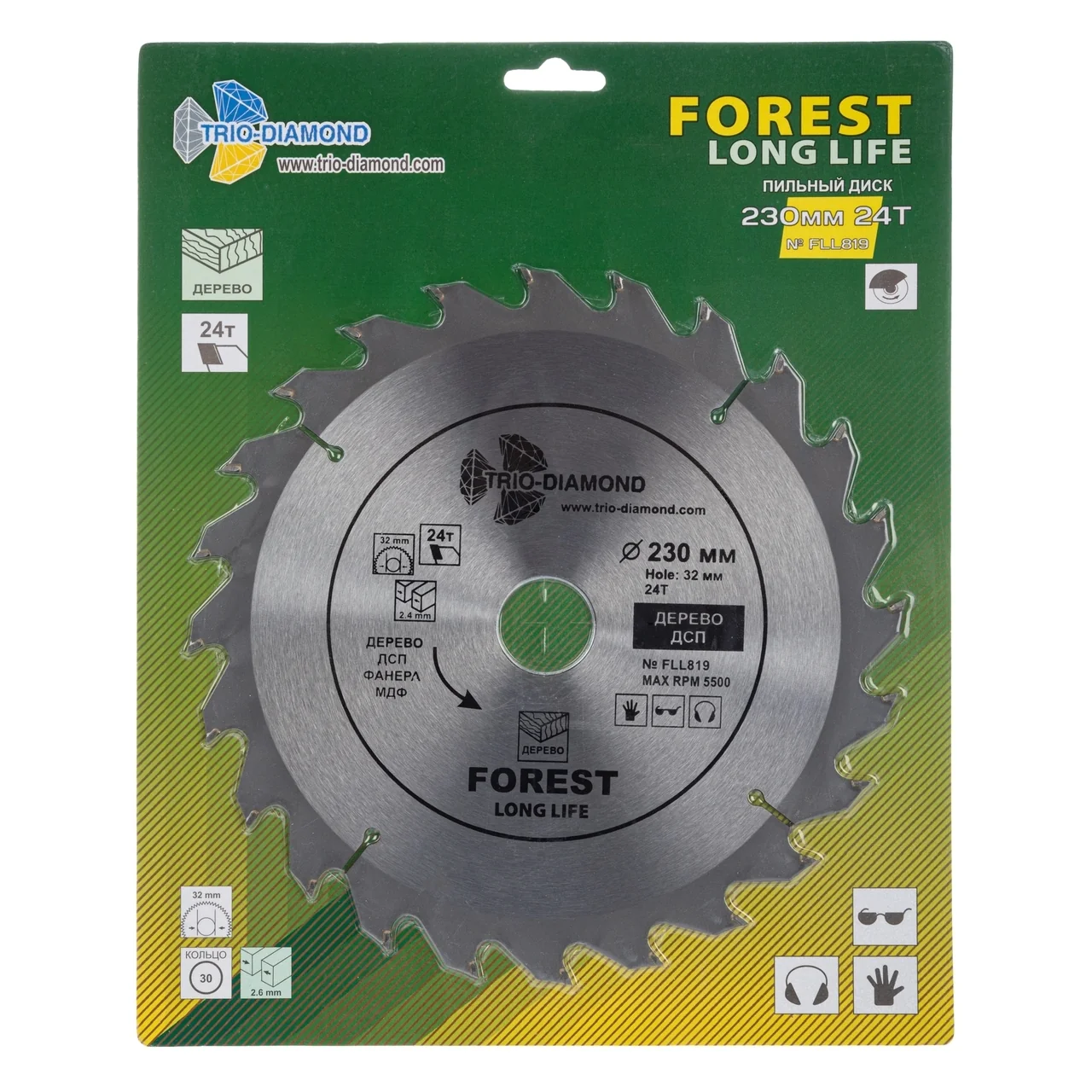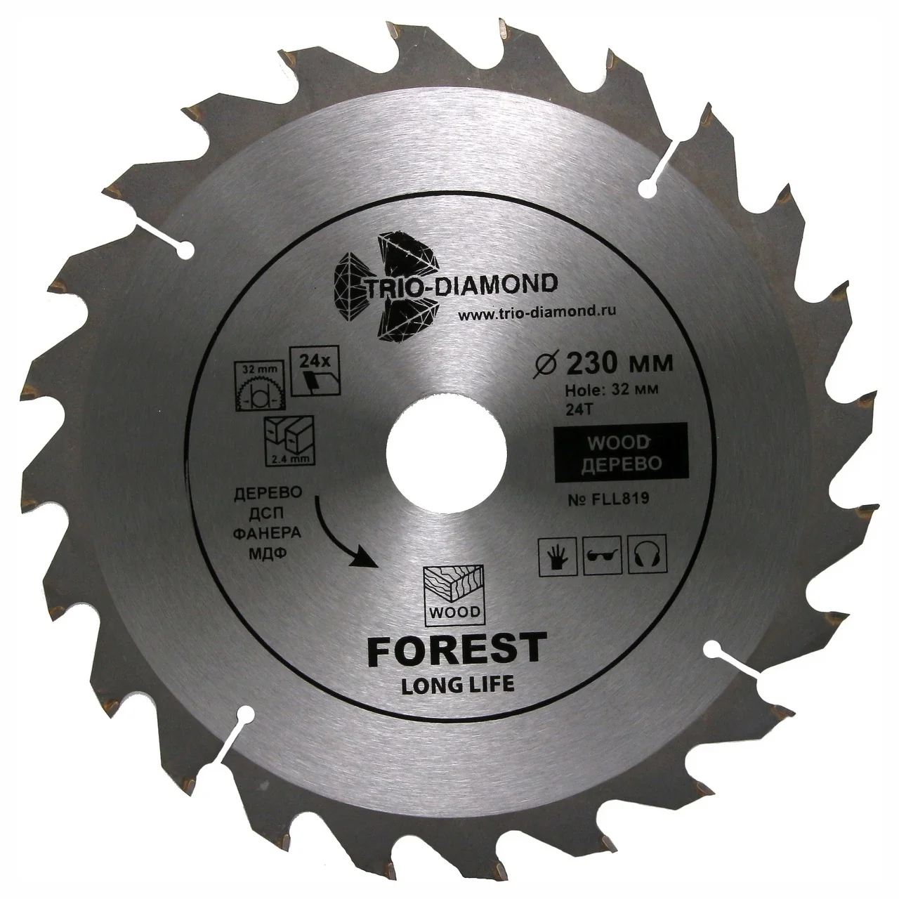 Изготовлен компанией TRIO-DIAMOND, этот диск имеет внешний диаметр 230 мм и посадочный диаметр 32/30 мм. Он оснащен 24 зубьями с углом заточки 15 градусов и геометрией ATB, что обеспечивает быстрый и чистый рез.