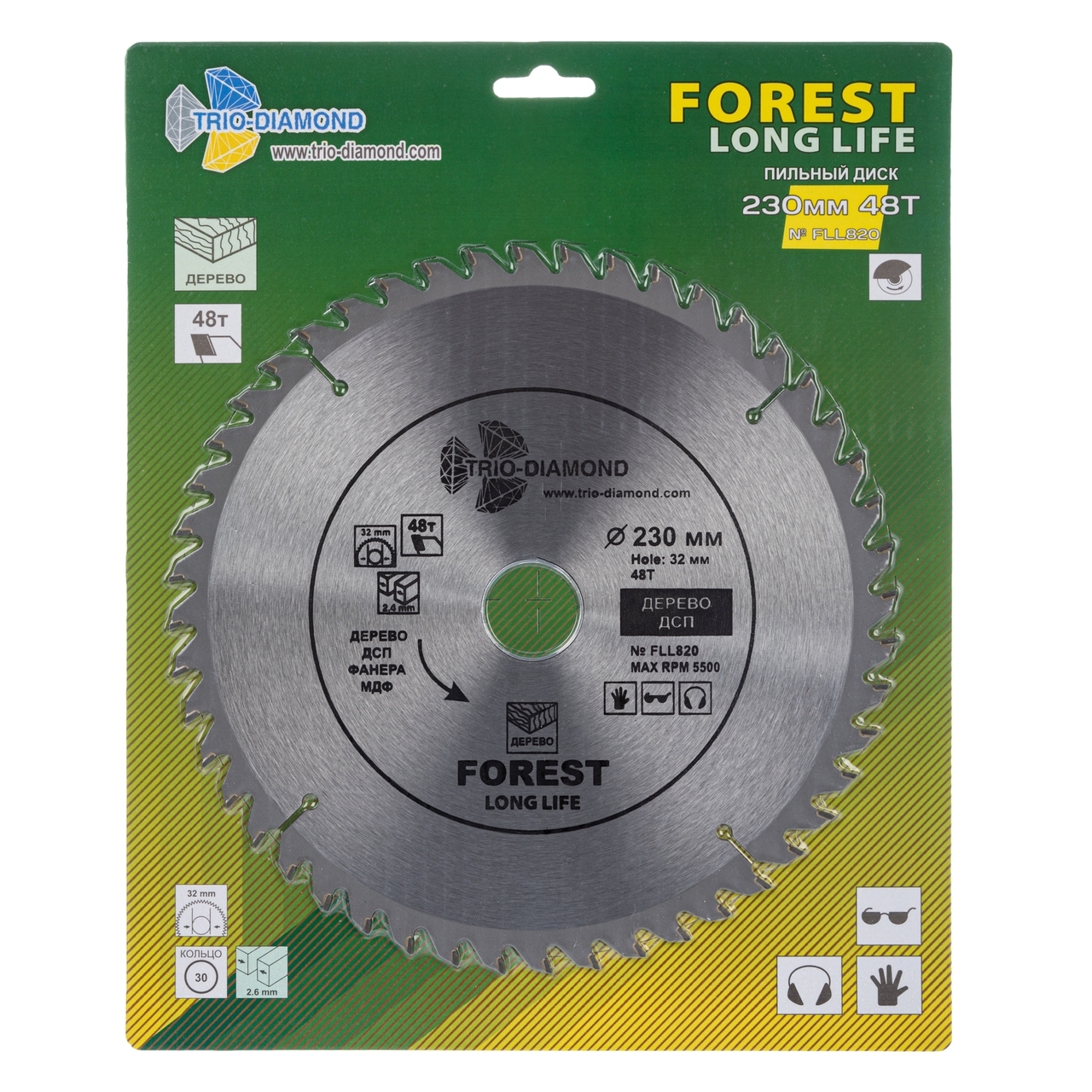 Пильный диск TRIO-DIAMOND из серии Forest Long Life позволяет работать на максимальных оборотах до 5 500 RPM. Толщина пропила составляет всего 2.6 мм, что способствует экономии материала и повышению точности.
