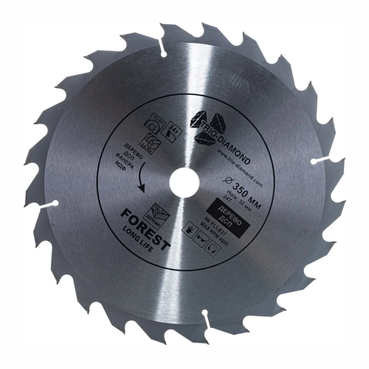 Изготовленный из высококачественных материалов, диск имеет наружный диаметр 350 мм и посадочный диаметр 32 мм. Он оснащен 24 зубьями с углом заточки 15° и геометрией зуба ATB, что обеспечивает надежный и быстрый рез.