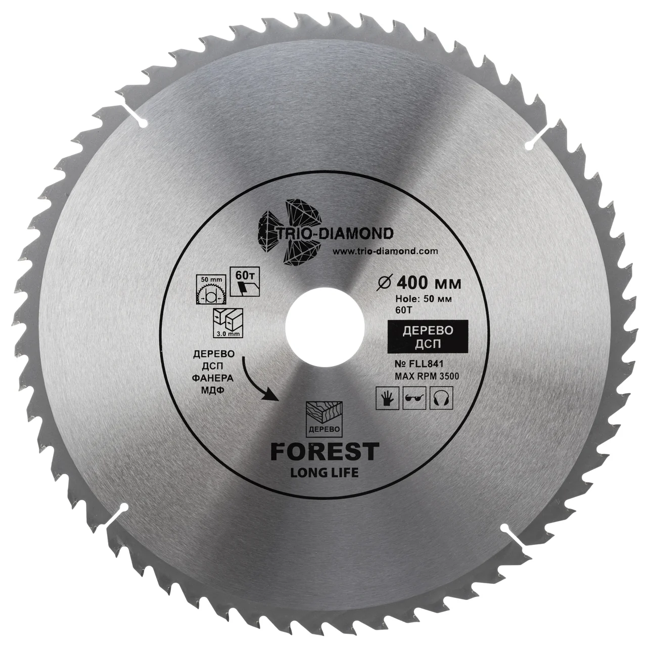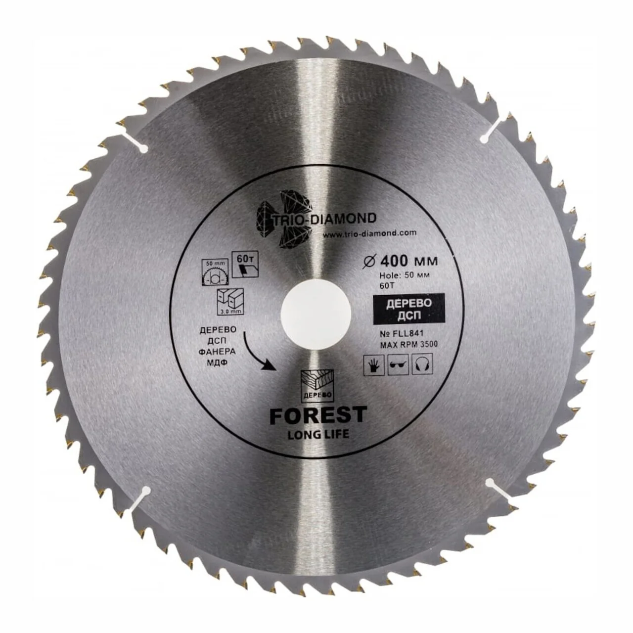 Изготовлен из высококачественных материалов, диск имеет наружный диаметр 400 мм и посадочный диаметр 50 мм. Благодаря 60 зубьям с углом заточки 15 градусов и геометрией ATB, он обеспечивает чистый рез без зазубрин.
