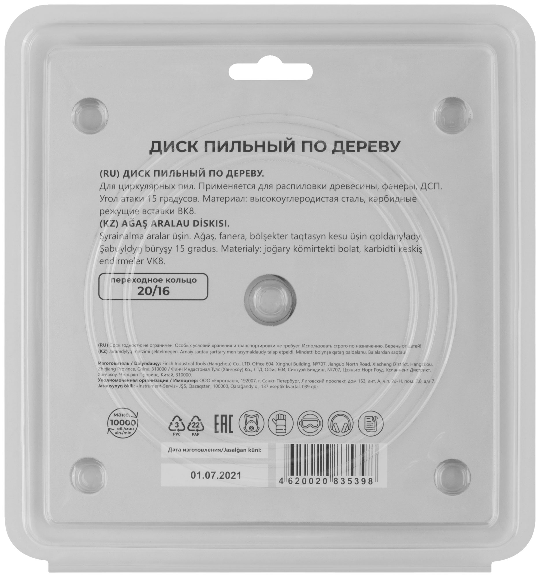 Диск оснащен зубьями из твердого сплава ВК8, что гарантирует долговечность и высокую скорость резки. Корпус выполнен из легированной высокоуглеродистой стали, обеспечивая прочность и надежность в работе. Угол атаки +15° способствует повышенной эффективности резки.