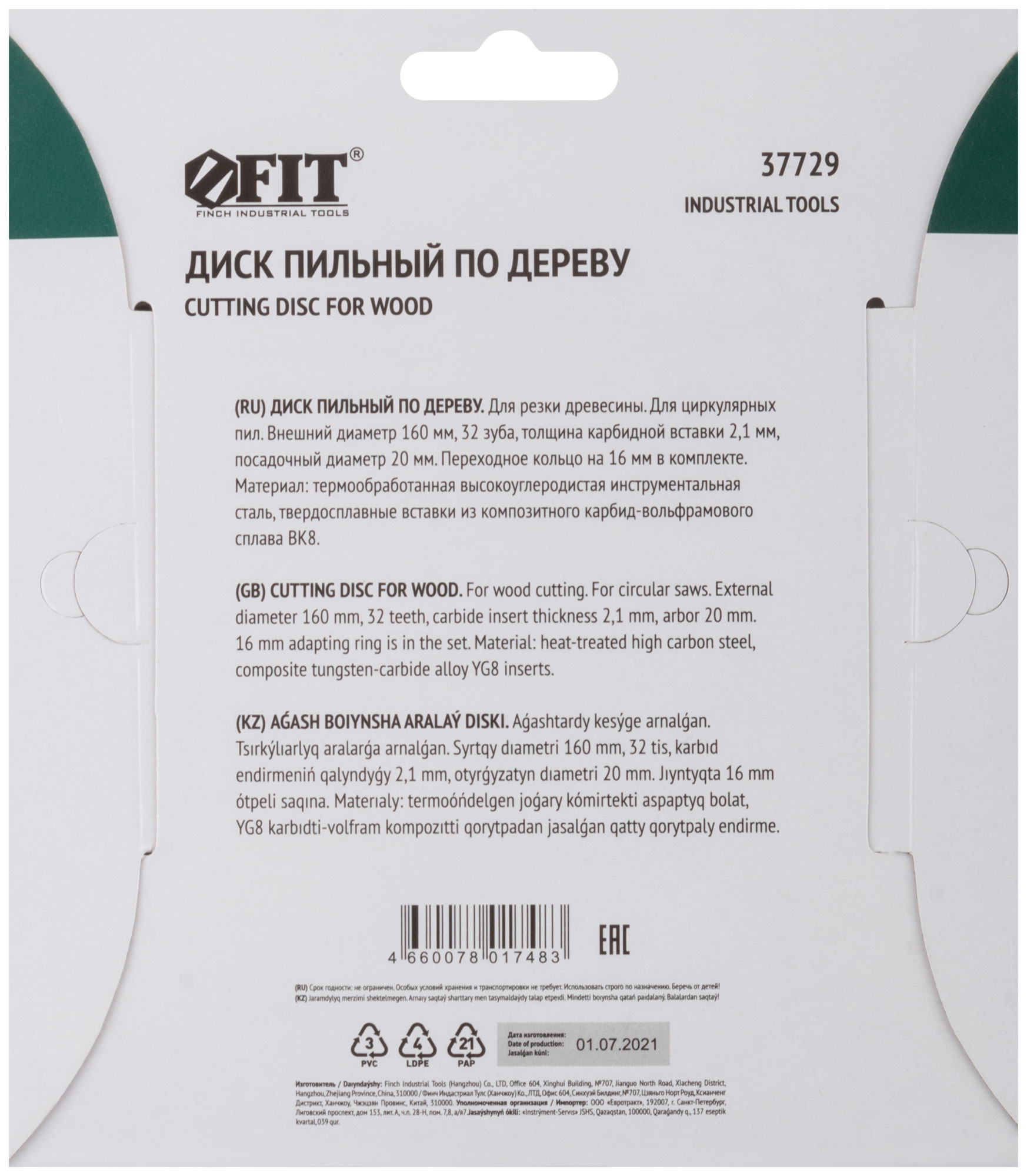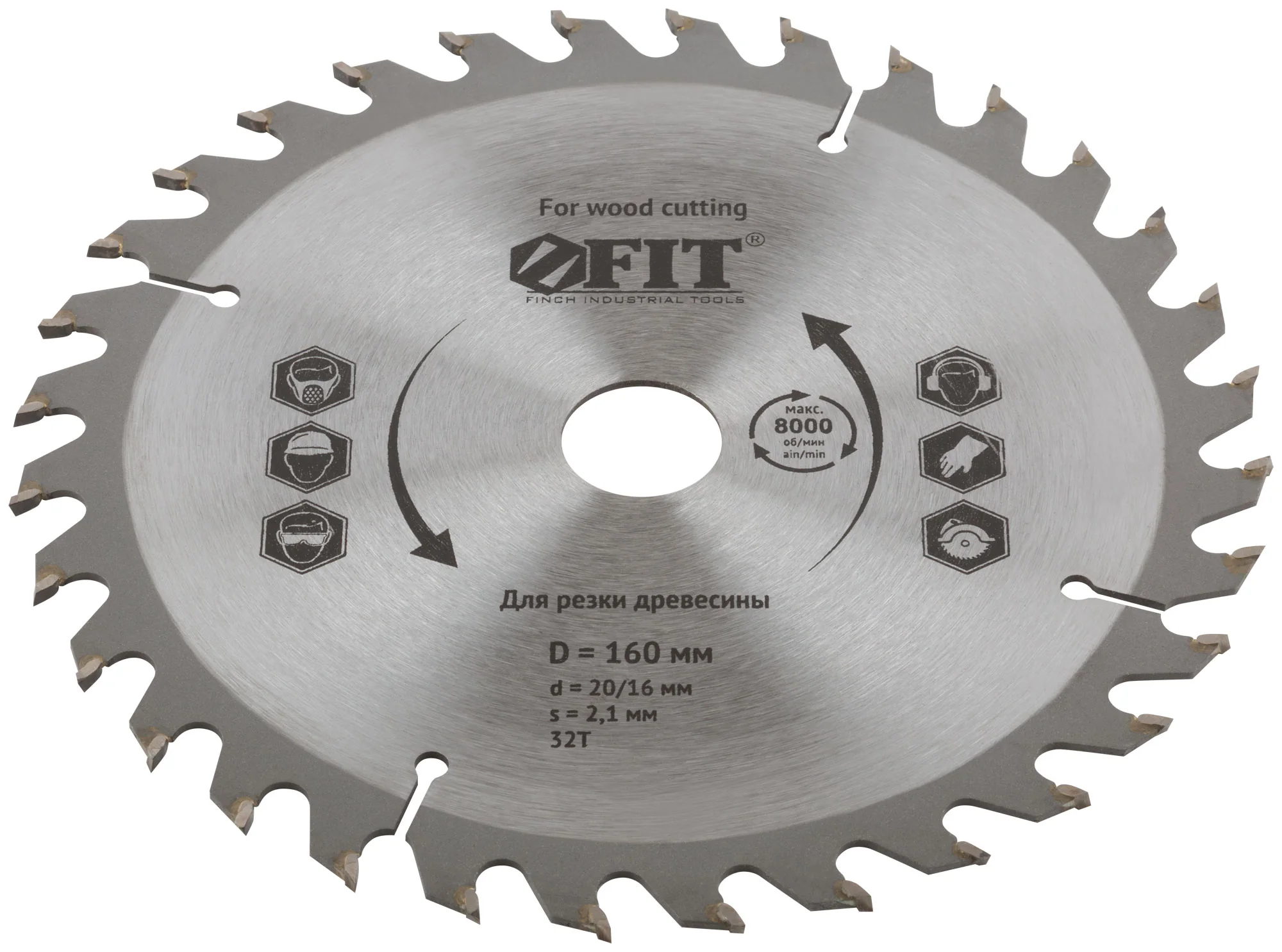 Преимущества пильного диска FIT включают в себя долговечность и способность выдерживать интенсивные нагрузки. Карбидные вставки обеспечивают чистый рез и высокую производительность. Типоразмер 160 х 20/16 х 32T подходит для большинства циркулярных пил.