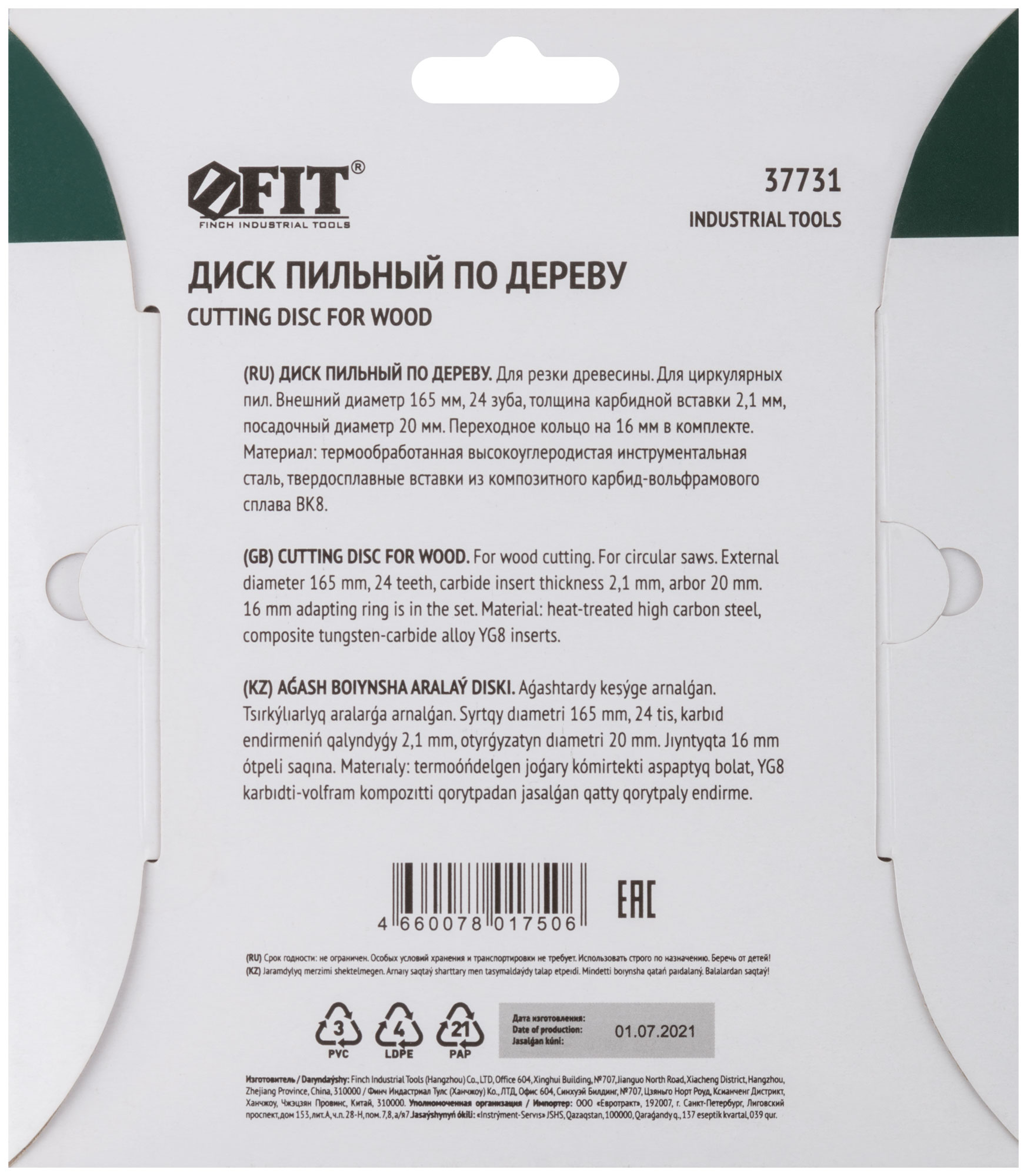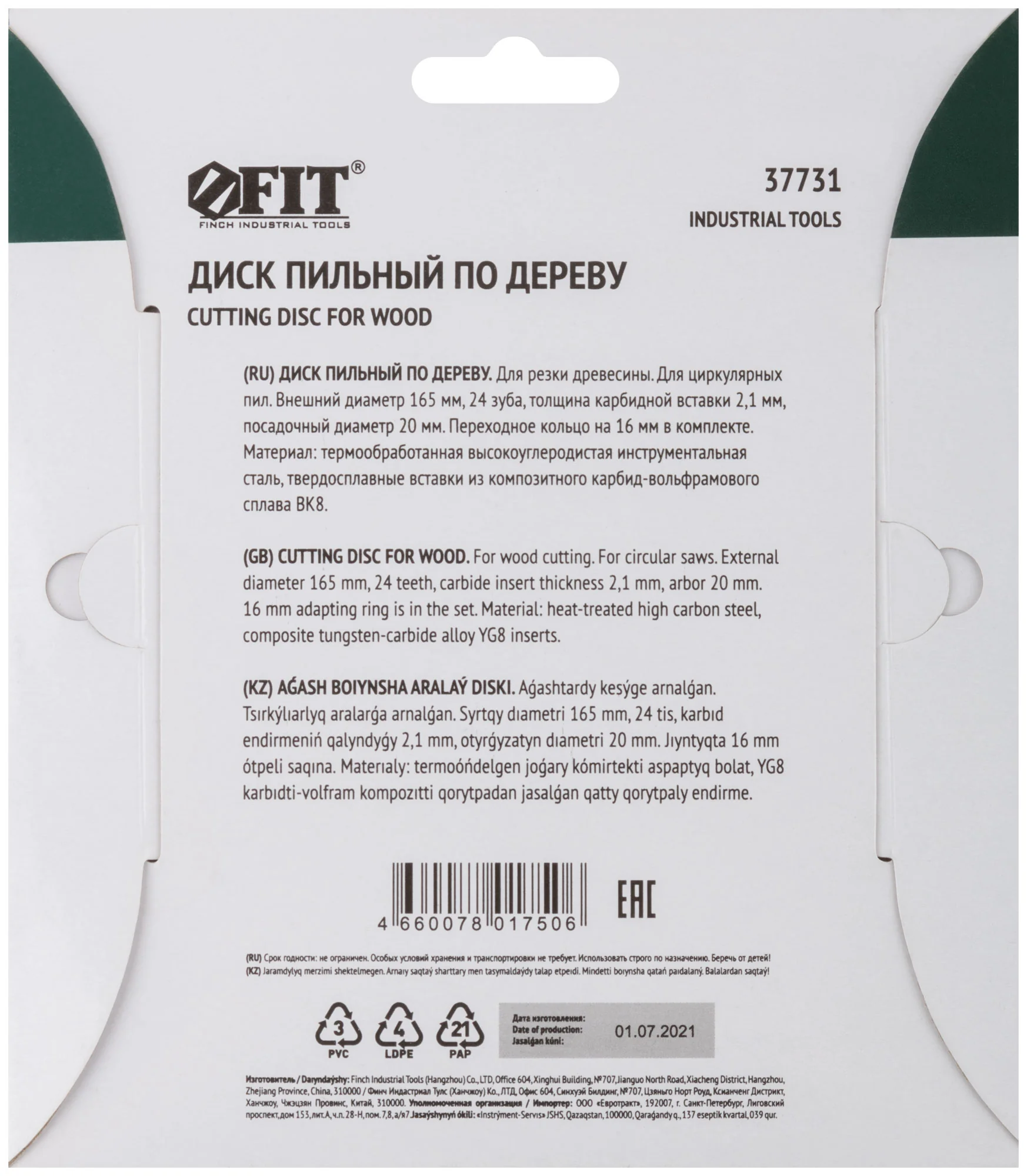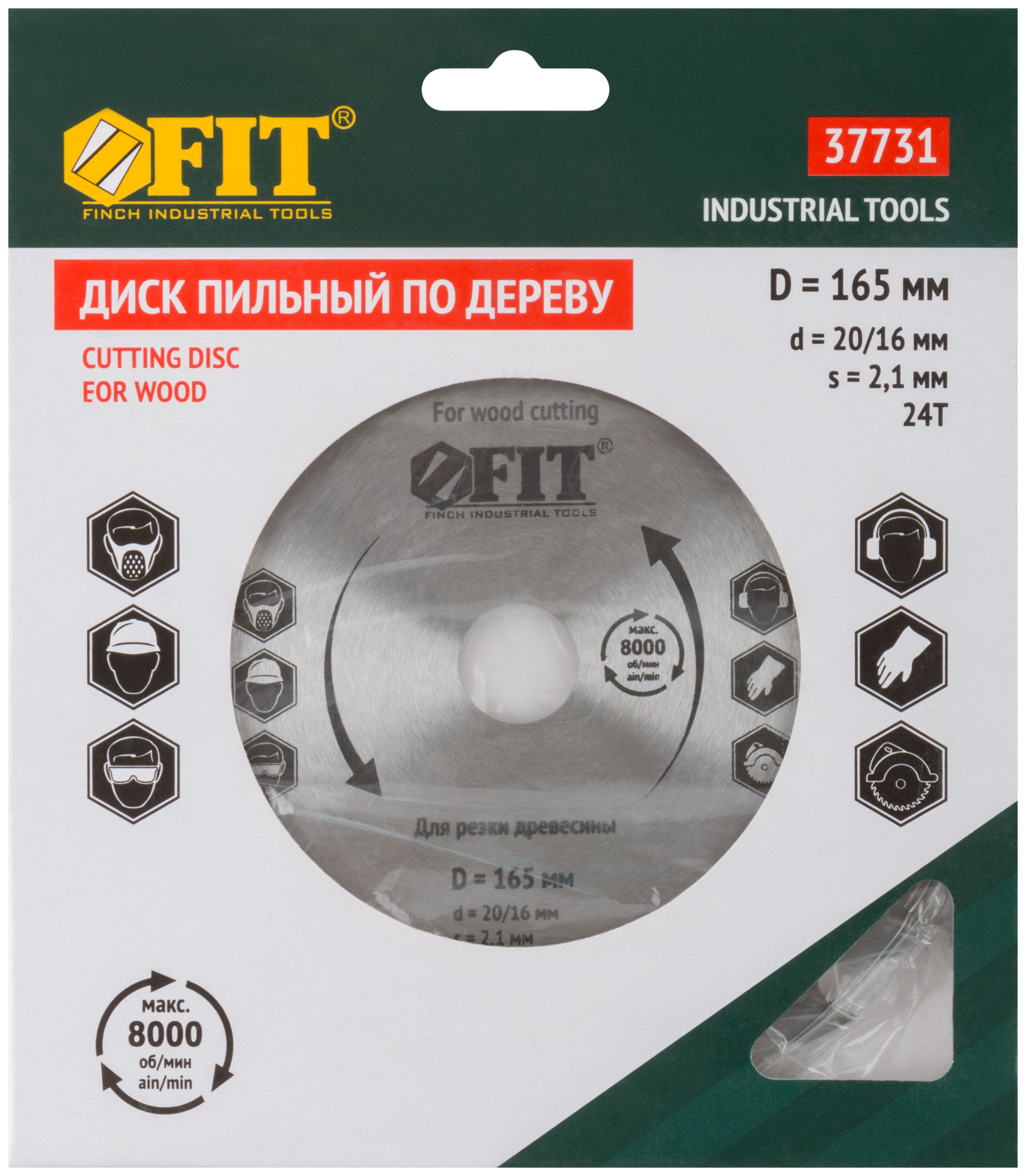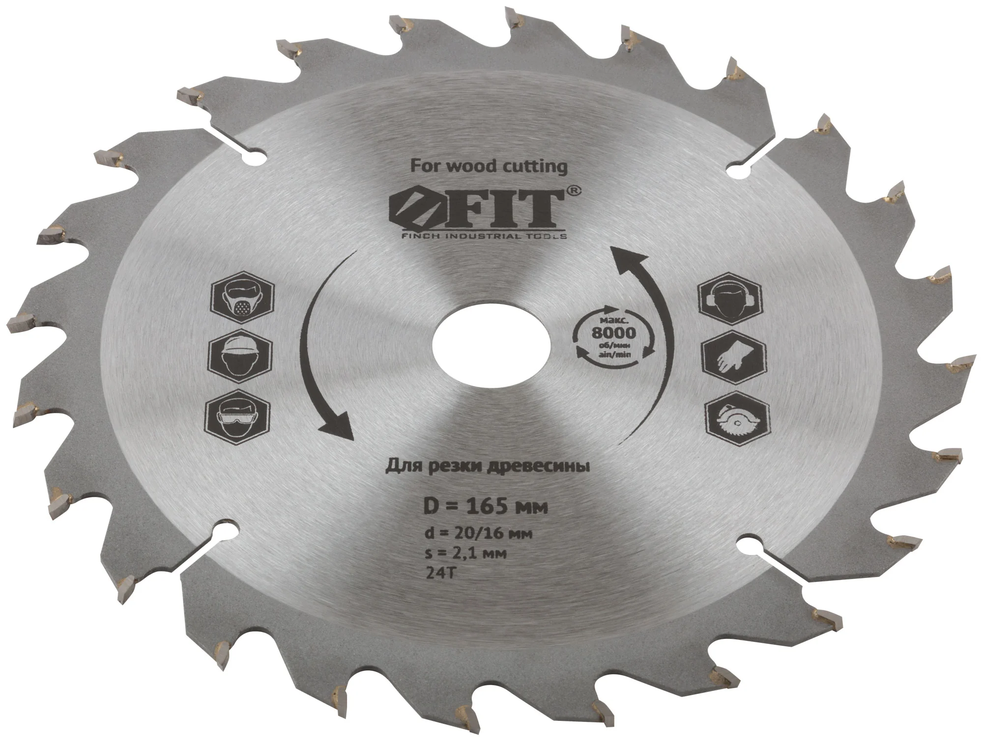 Пильный диск FIT 37731 имеет типоразмер 165 х 20/16 х 24T. Это обеспечивает высокую точность и плавность реза, минимизируя вибрацию и улучшая качество работы.