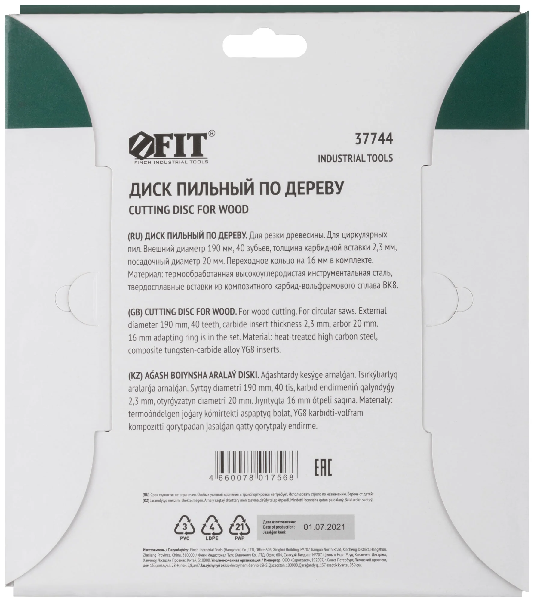 Диск пильный FIT 190х20/16х40T для распиловки дерева