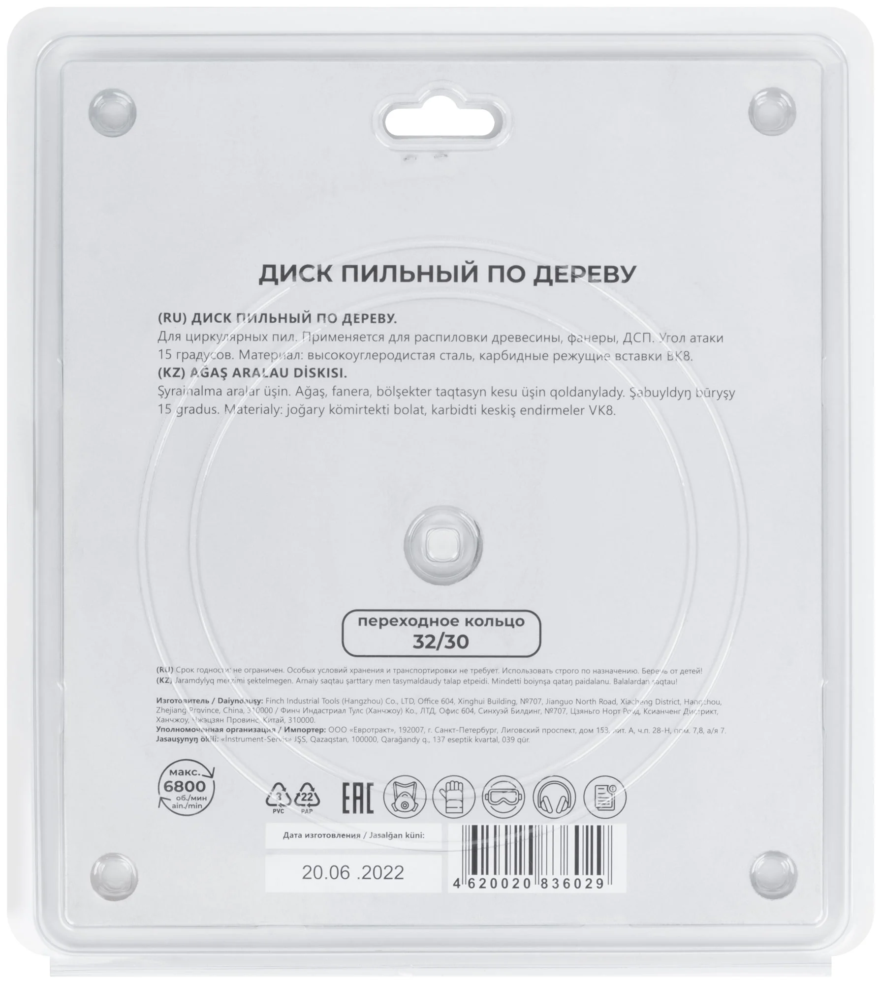 Этот диск изготовлен из легированной высокоуглеродистой стали, что обеспечивает прочность и долговечность. Зубья из карбида вольфрама ВК8 поддерживают острое режущее лезвие, а угол атаки +15° способствует эффективному резанию.