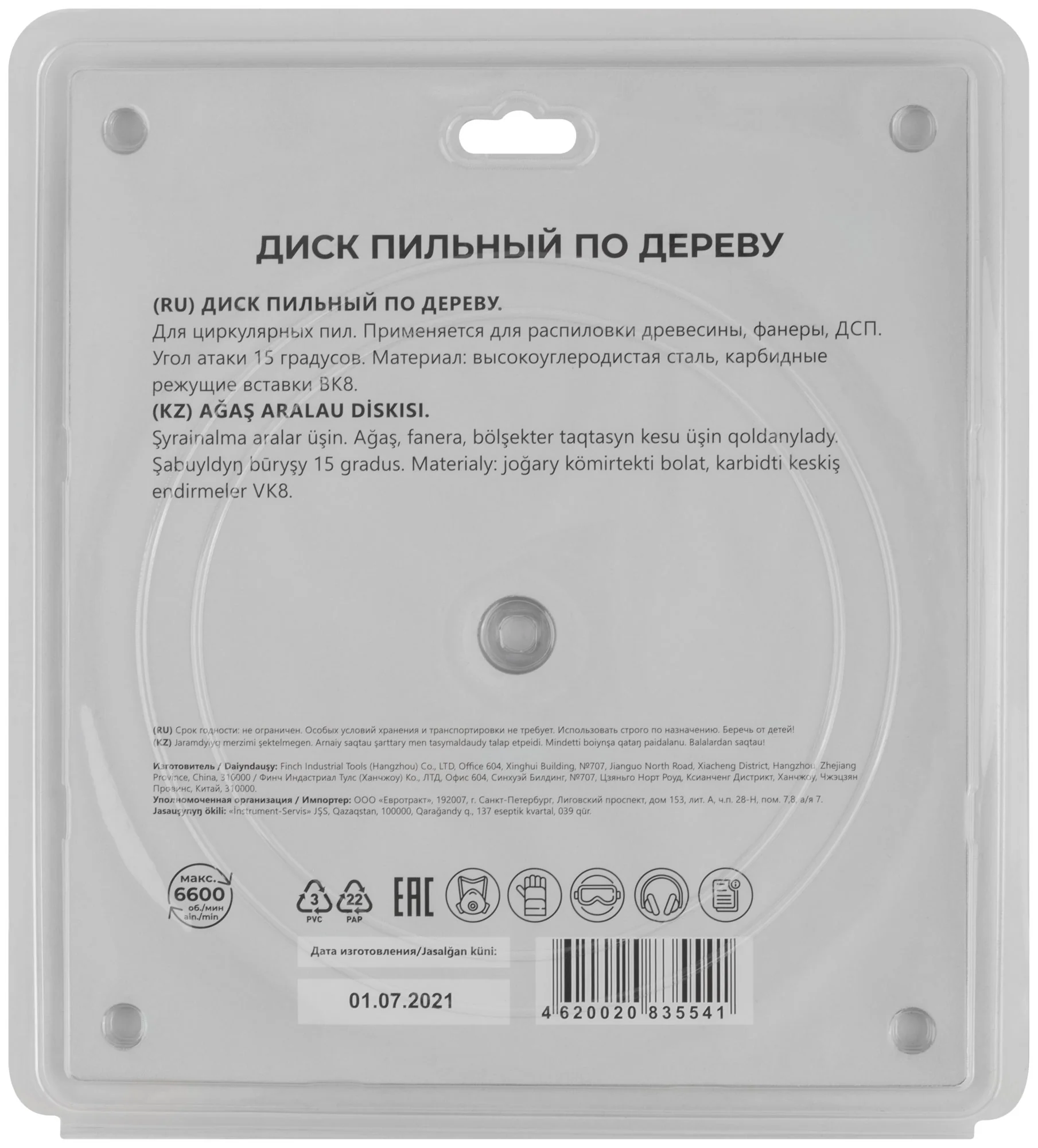 Изготовлен из легированной высокоуглеродистой стали с зубьями из твердого сплава ВК8 (карбид вольфрама), что гарантирует долговечность и стойкость к износу. Угол атаки +15° позволяет эффективно обрабатывать древесину, минимизируя сопротивление и износ.