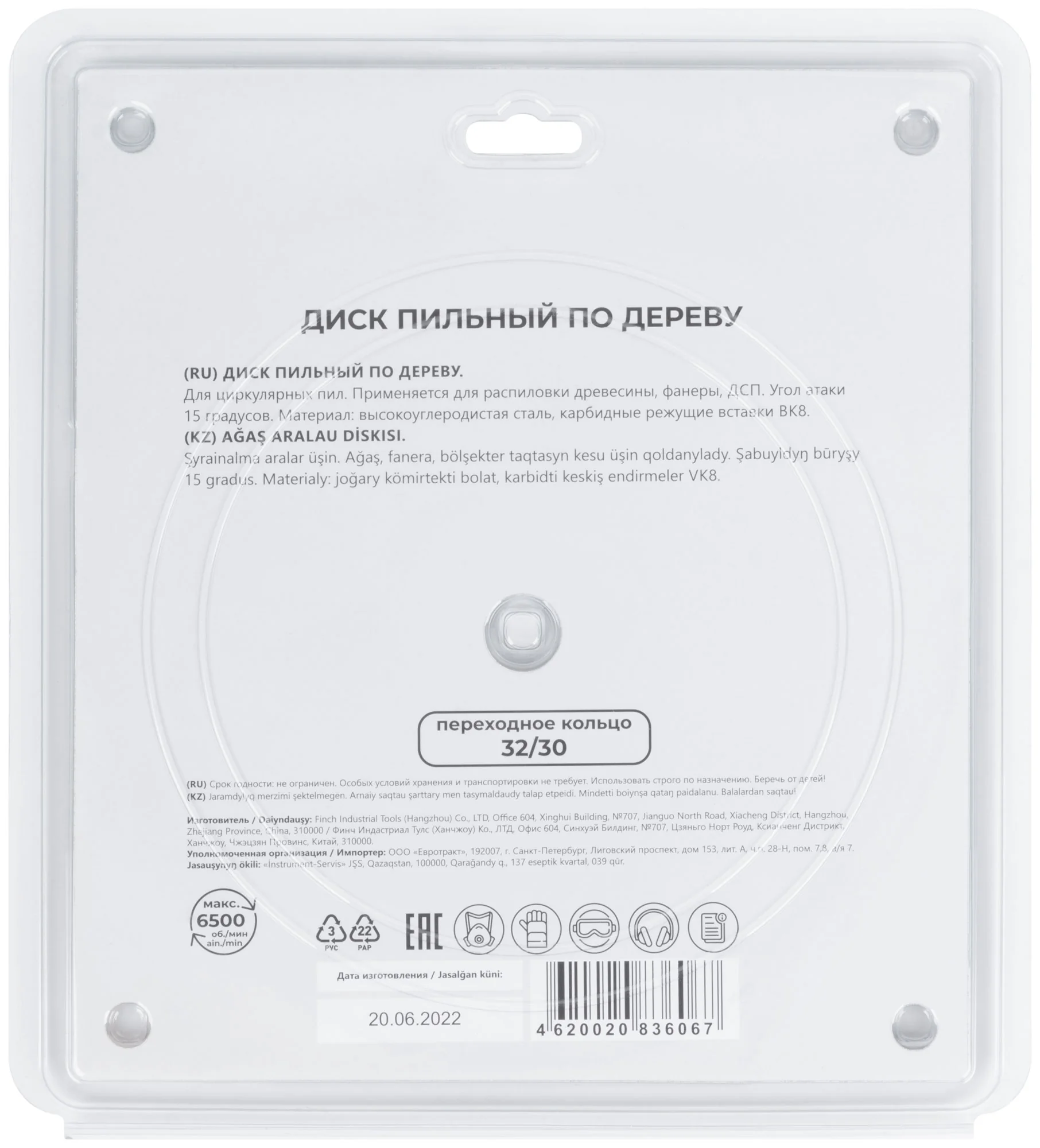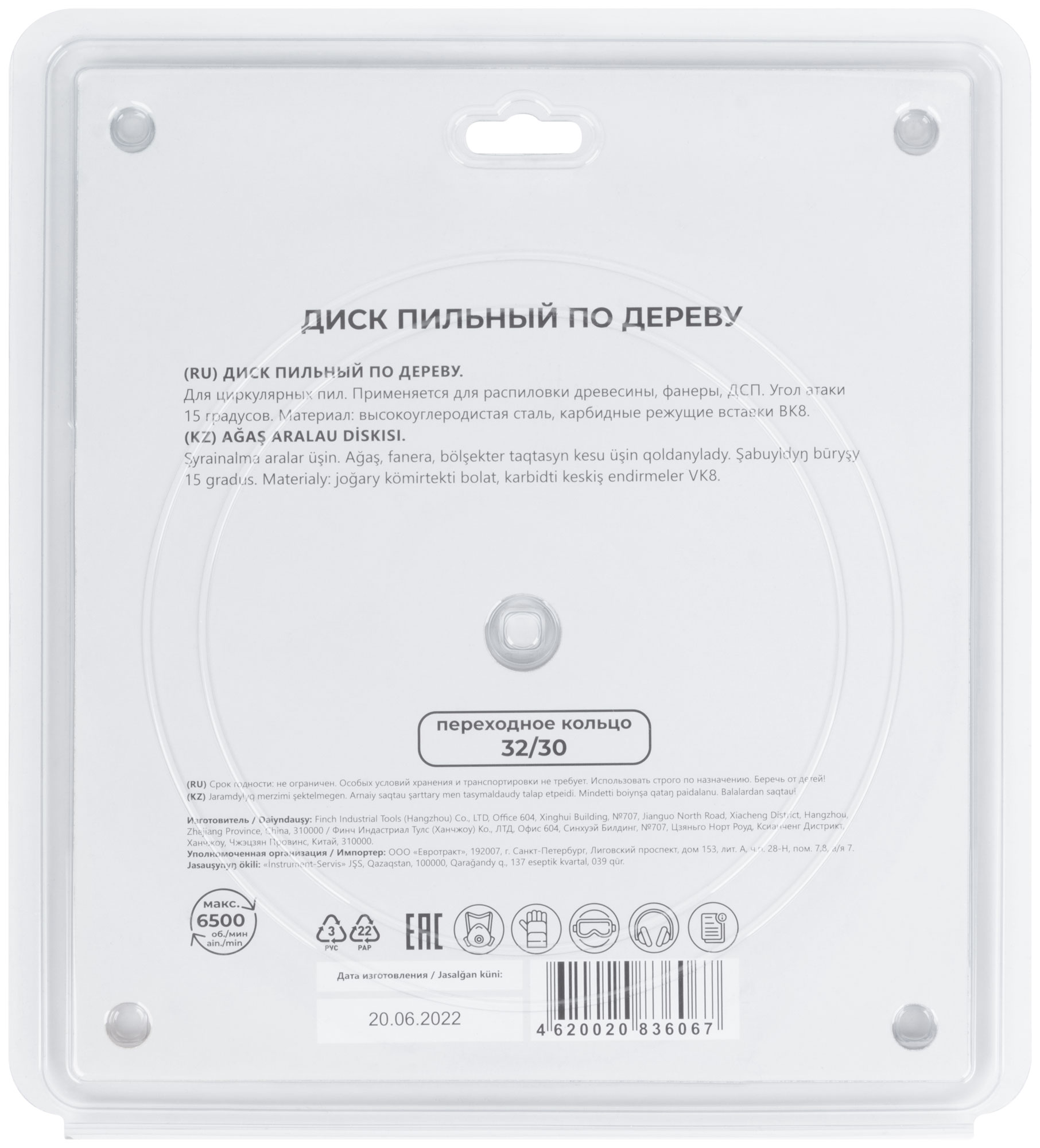 Изготовлен из легированной высокоуглеродистой стали, обеспечивающей прочность и долговечность. Зубья диска выполнены из твердого сплава ВК8 (карбид вольфрама), что гарантирует чистый и точный рез. Угол атаки +15° способствует более агрессивному резанию, снижая усилия при работе.