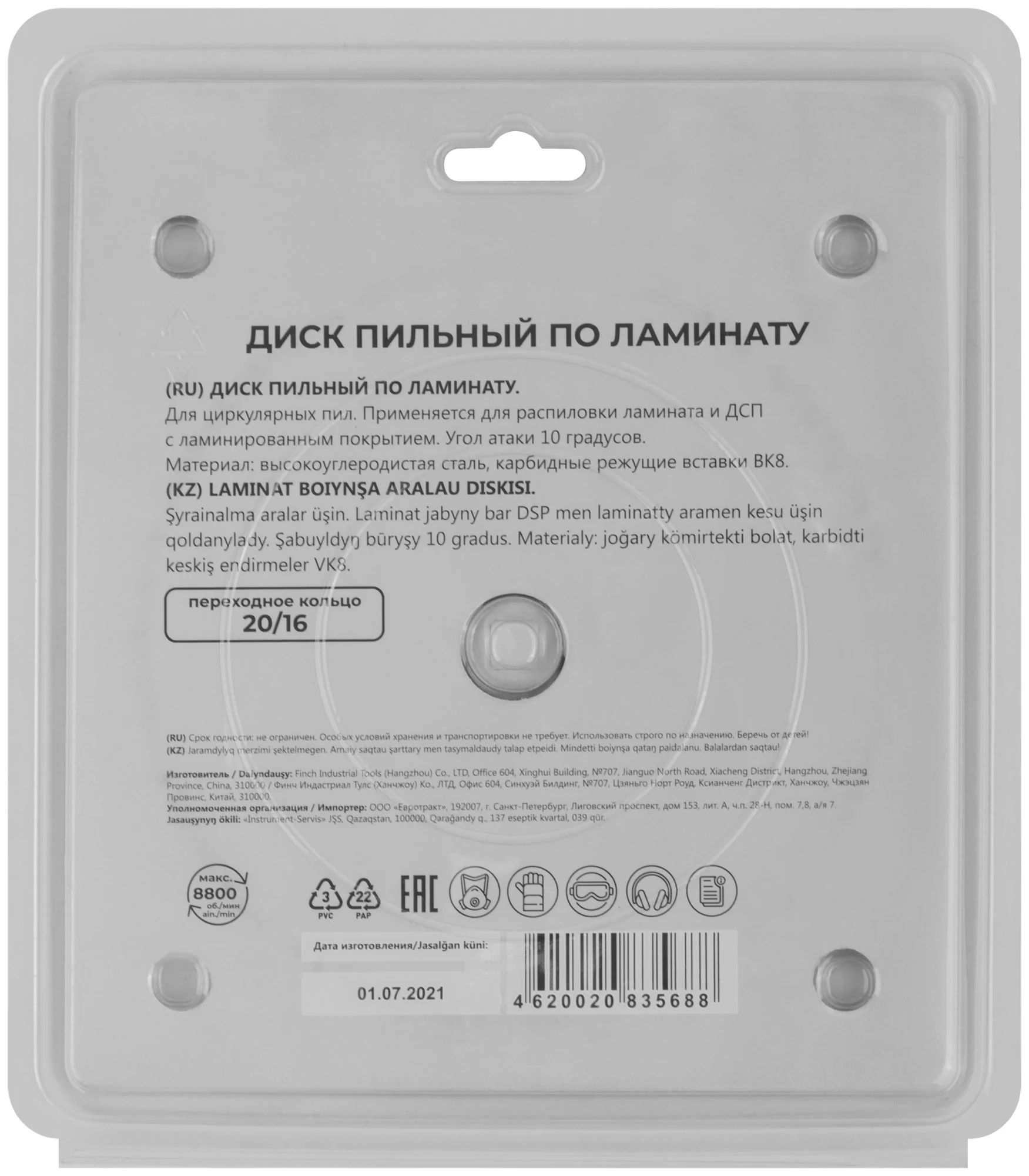 Пильный диск имеет угол атаки +10°, оптимальный для работы с ламинатом, минимизируя сколы и обеспечивая гладкую поверхность реза. Упакован в блистер для удобства хранения и транспортировки.
