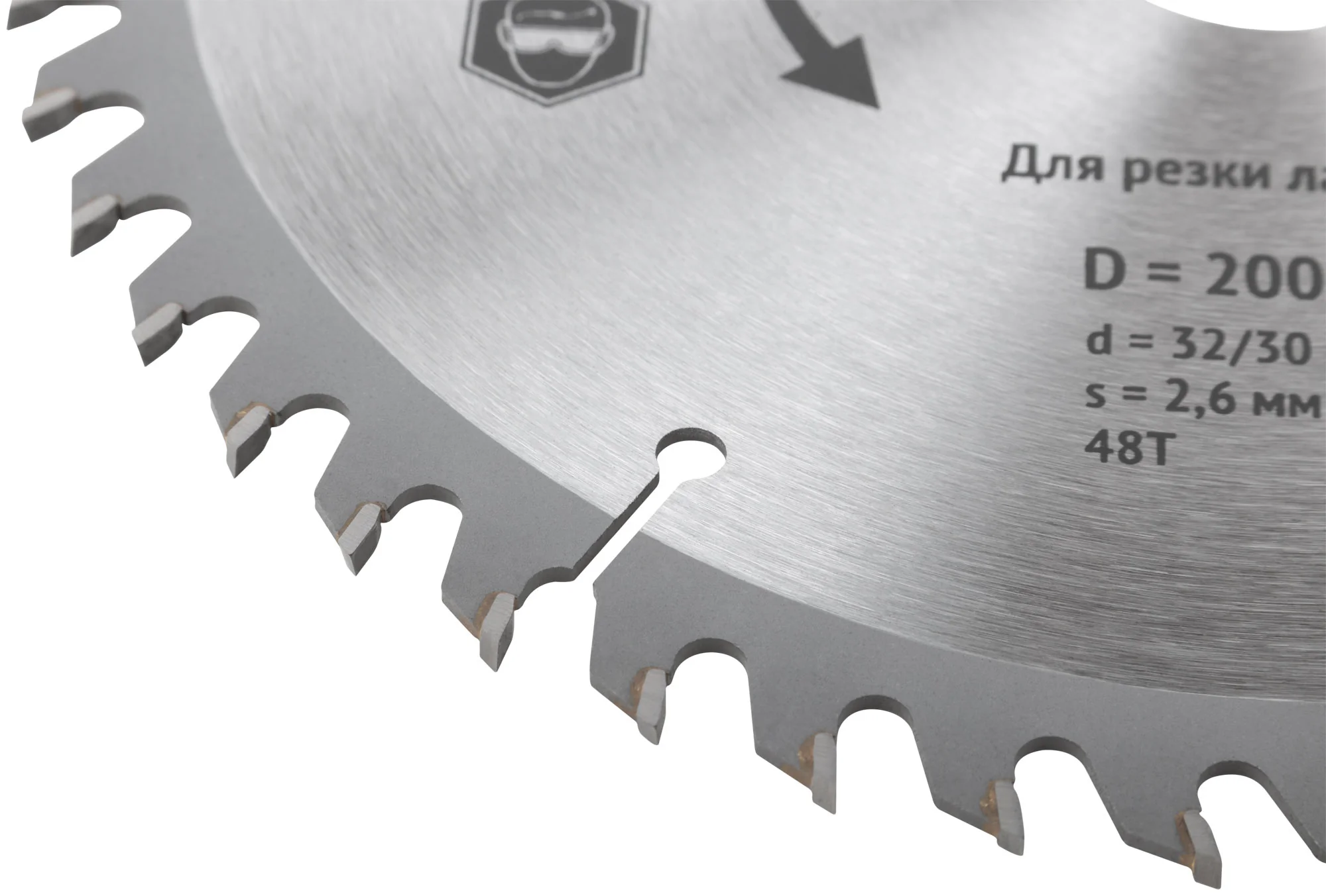 Изготовлен из высокоуглеродистой стали с карбидными режущими вставками ВК8, что обеспечивает долговечность и устойчивость к износу при частом использовании. Диск обладает типоразмером 200 х 32/30 х 48T, что делает его совместимым с большинством циркулярных пил.