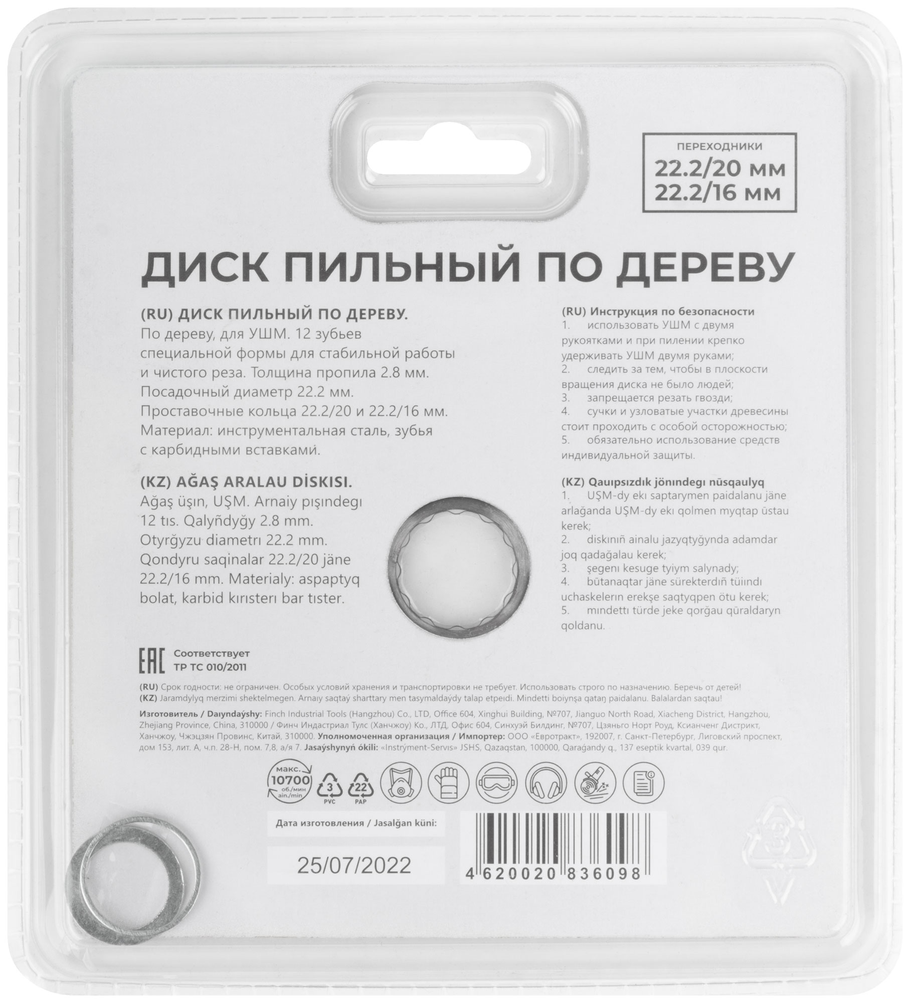 Диск изготовлен из инструментальной стали, что обеспечивает его долговечность и надежность. Специальные карбидные вставки на зубьях гарантируют стабильную работу при высоких нагрузках. В комплекте идут переходные кольца 22,2/20 мм и 22,2/16 мм, что позволяет использовать диск с различными моделями УШМ.
