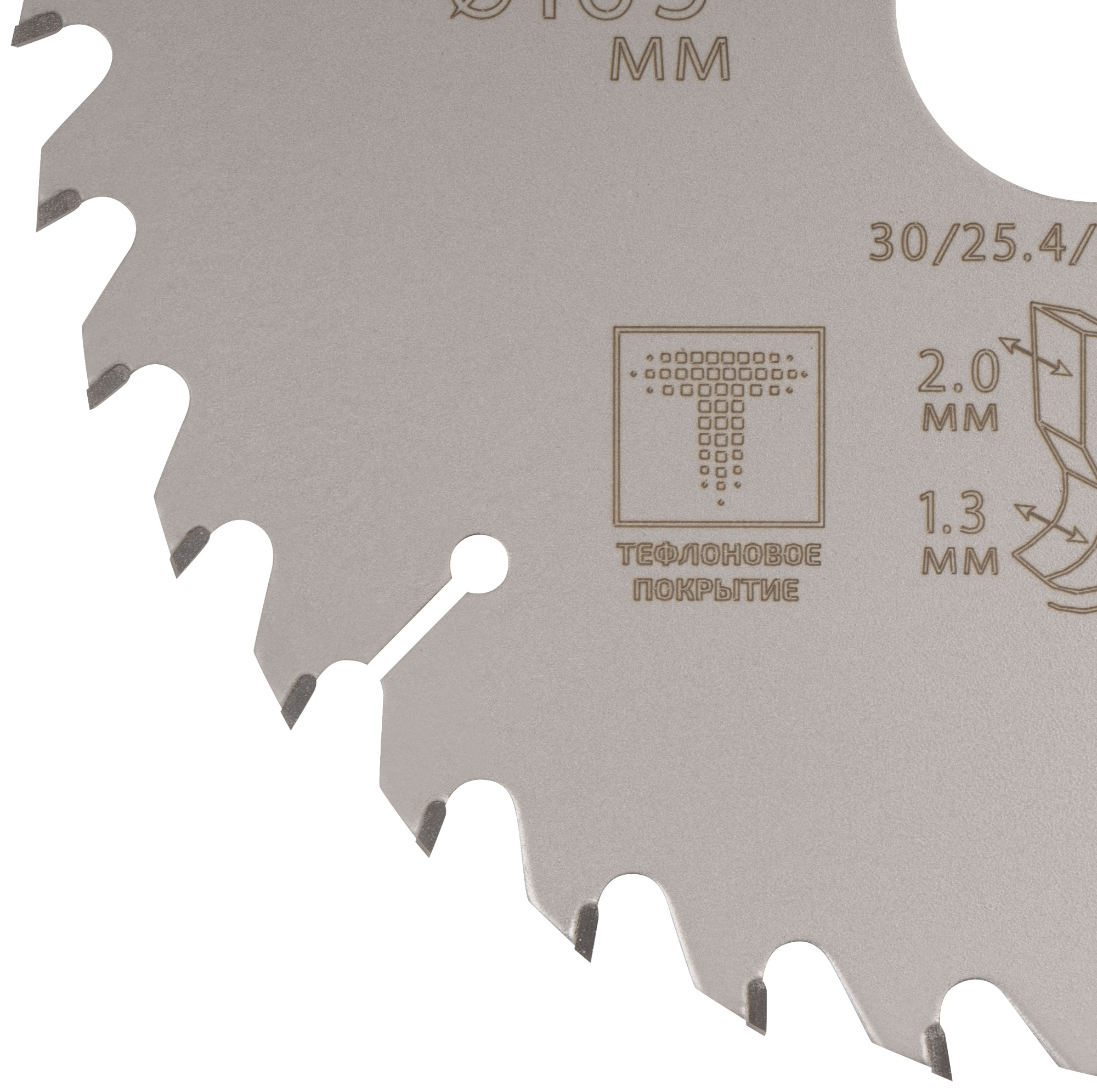 Основной материал диска — инструментальная сталь с карбидными зубьями, что обеспечивает надежность и долговечность. Тефлоновое покрытие и компенсационные пазы способствуют быстрому теплоотводу, предотвращая деформацию диска и обеспечивая ровный рез.