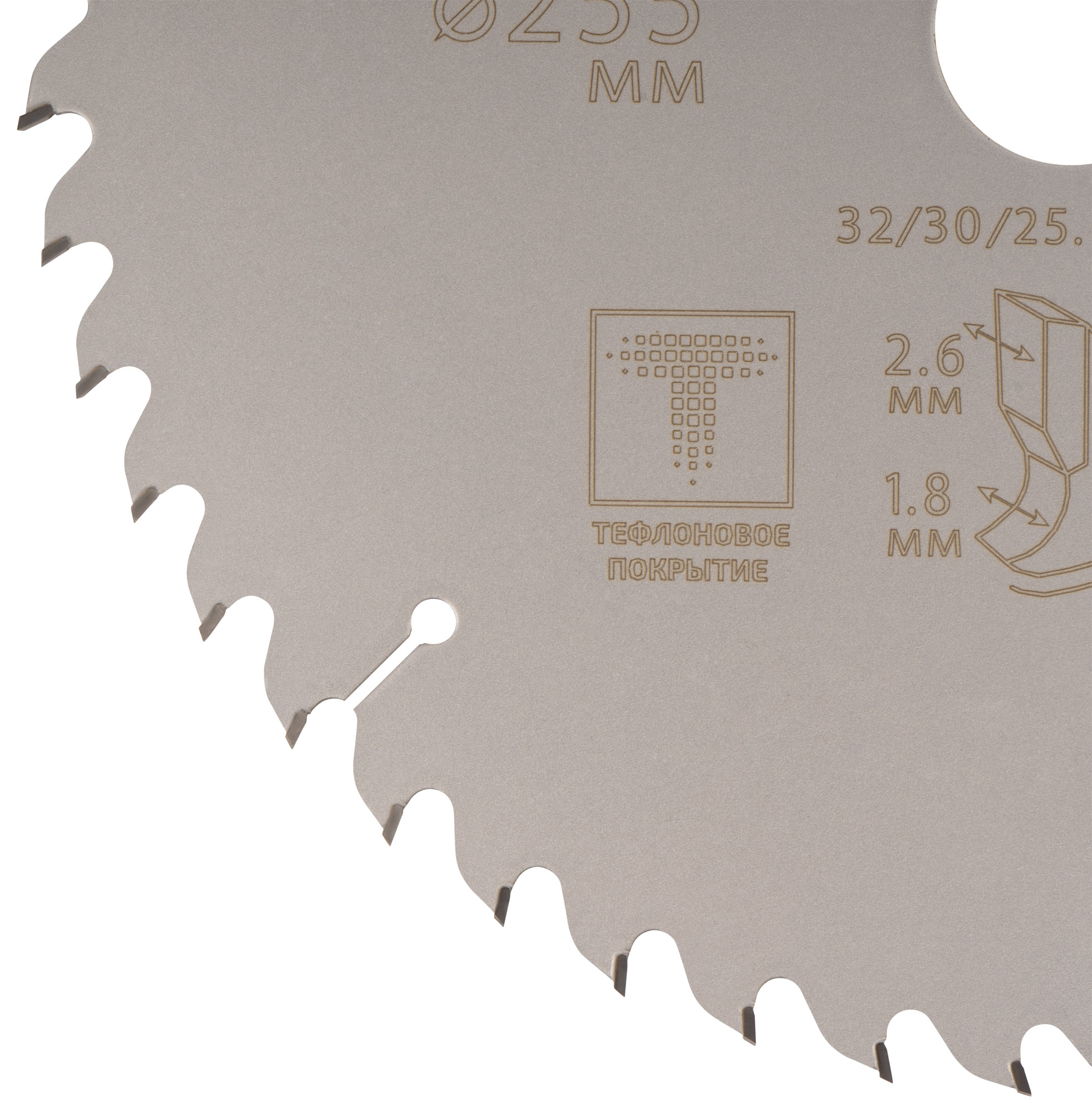 Диск изготовлен из инструментальной стали с карбидными зубьями и дополнен тефлоновым покрытием. Это покрытие обеспечивает эффективный теплоотвод, предотвращая перегрев и деформацию диска, что продлевает срок его службы. Компенсационные пазы на диске способствуют улучшению качества реза.