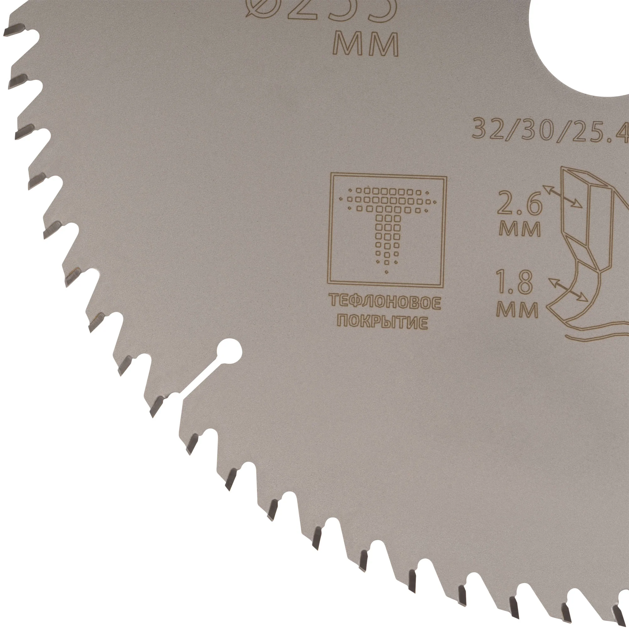 Диск изготовлен из инструментальной стали и оснащен карбидными зубьями, которые обеспечивают прочность и долгий срок службы. Тефлоновое покрытие снижает трение, предотвращает перегрев и деформацию. Компенсационные пазы способствуют быстрому теплоотводу, что гарантирует стабильную работу и ровный рез.