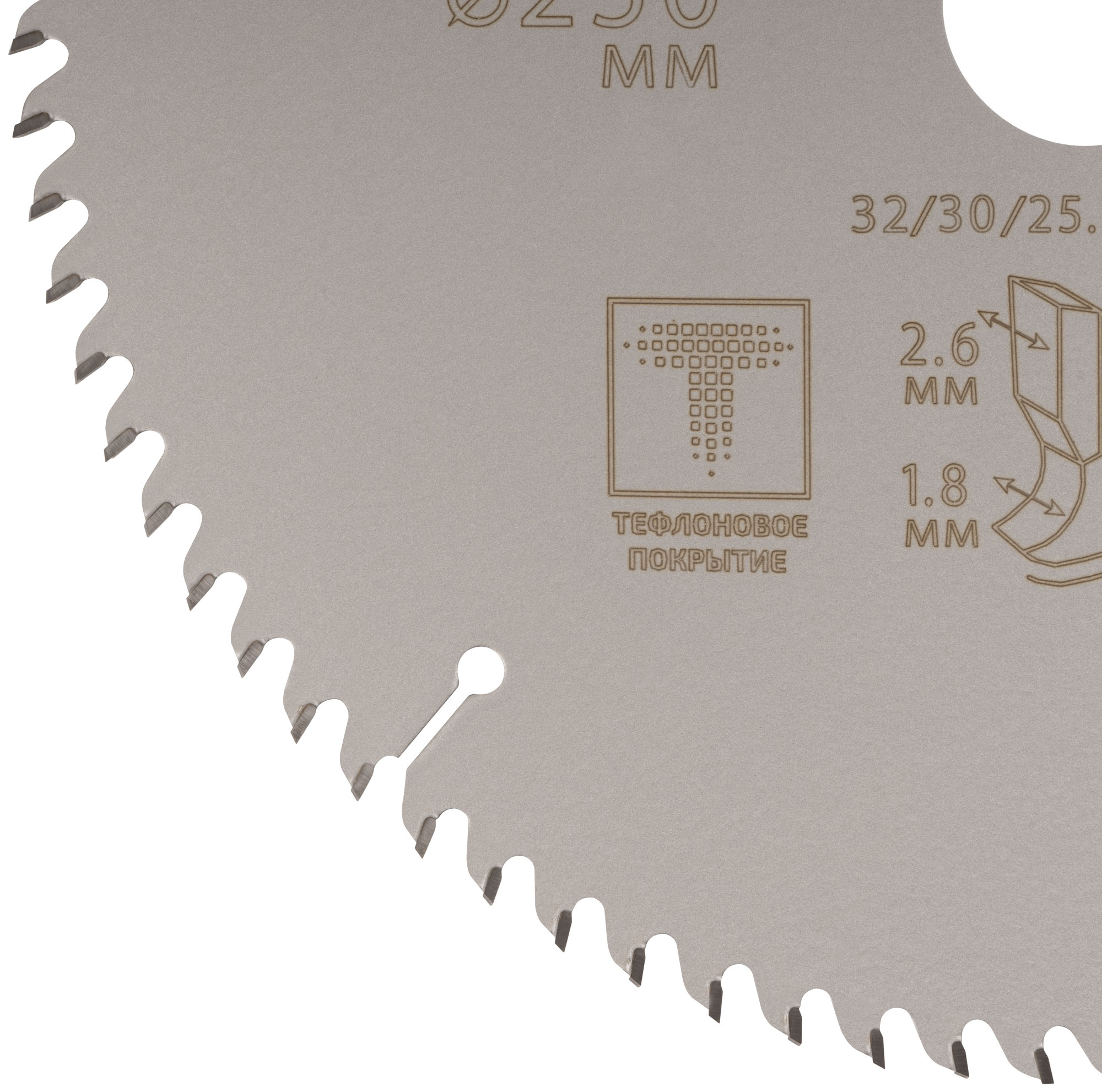 Диск изготовлен из высококачественной инструментальной стали с карбидными зубьями, что обеспечивает долговечность и устойчивость к износу. Тефлоновое покрытие снижает трение и обеспечивает легкость реза, а компенсационные пазы способствуют быстрому теплоотводу, предотвращая деформацию диска.