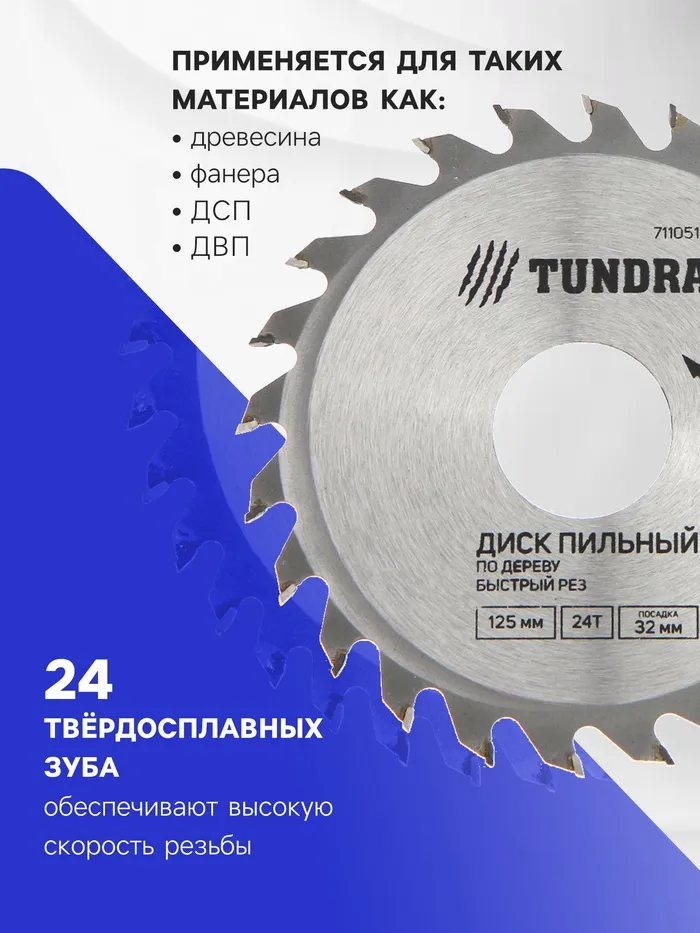 Диск пильный по дереву ТУНДРА, быстрый рез, 125×32 мм (кольца на 22.20,16), 24 зуба — Характеристики