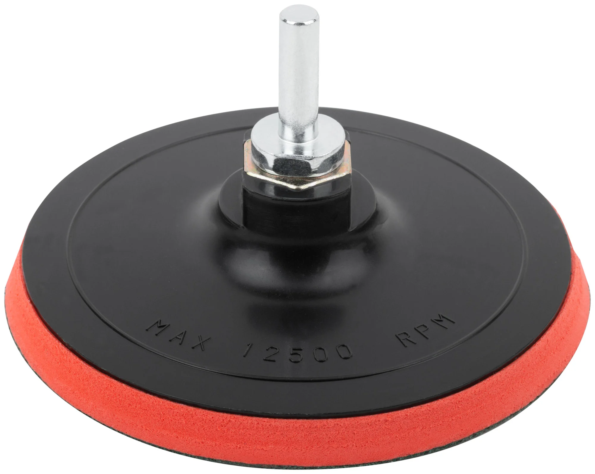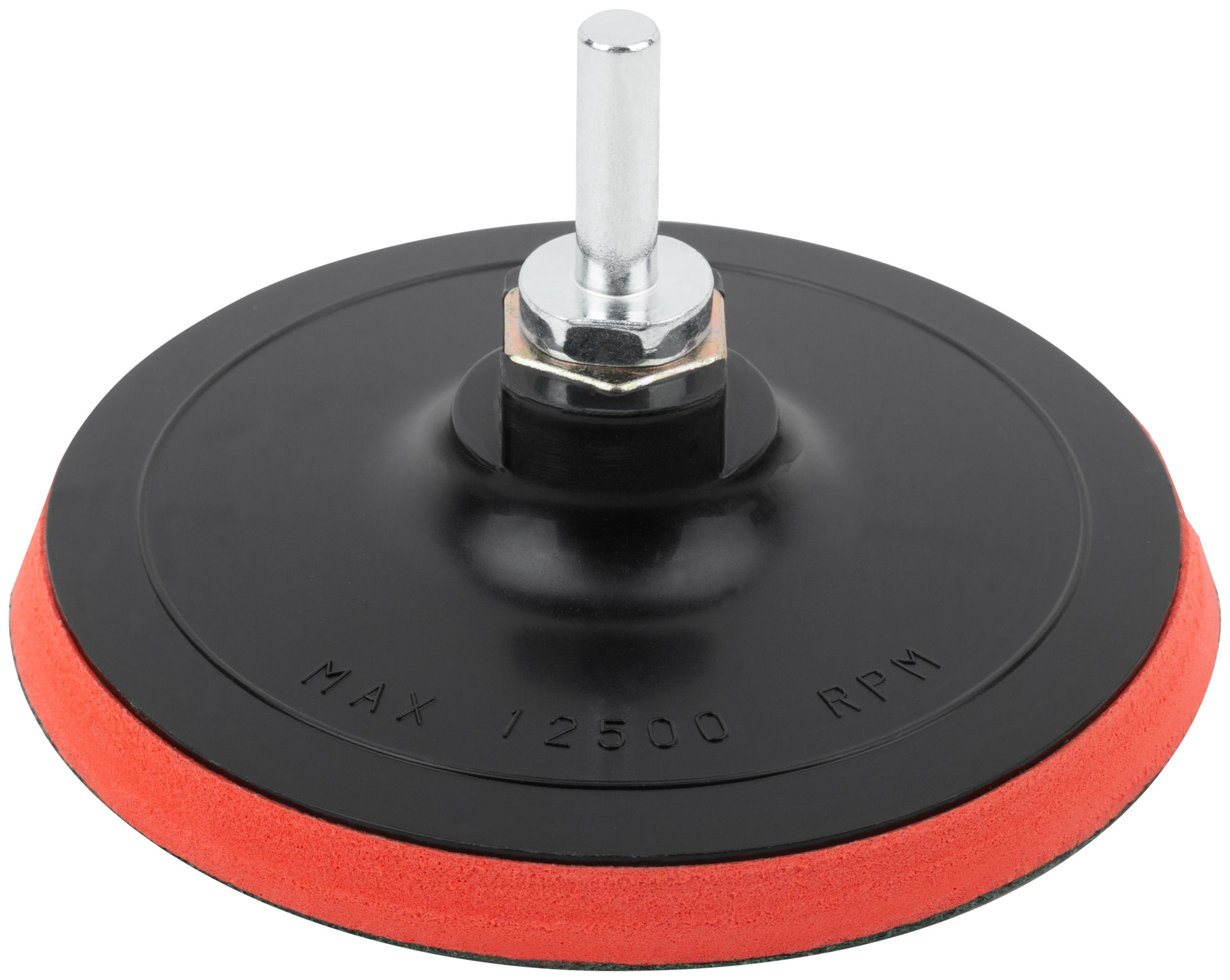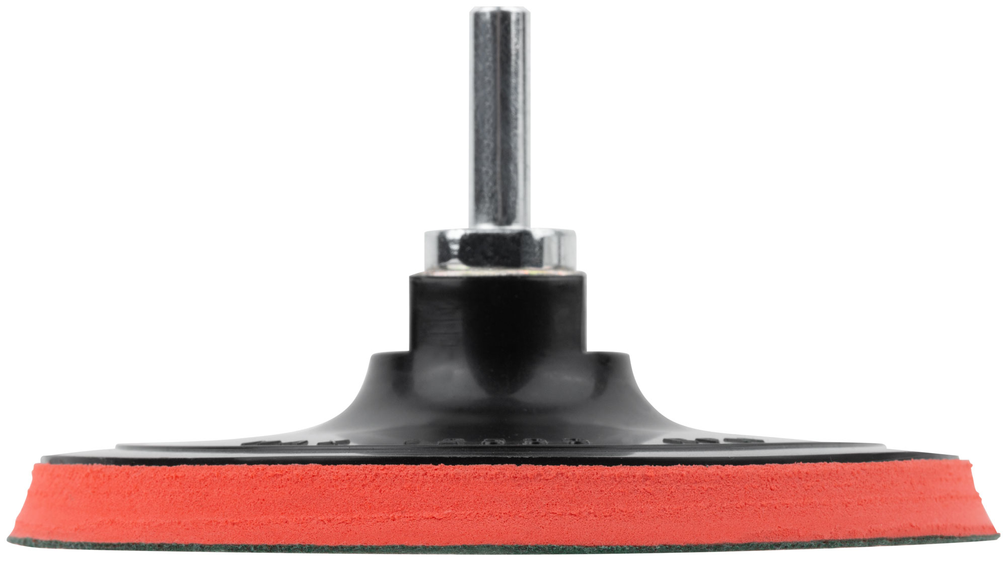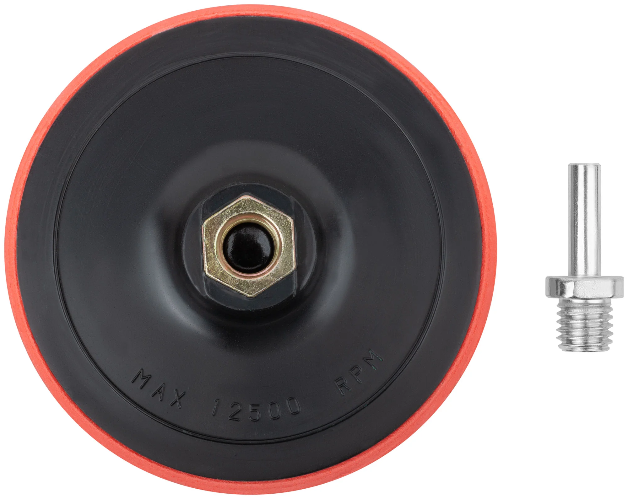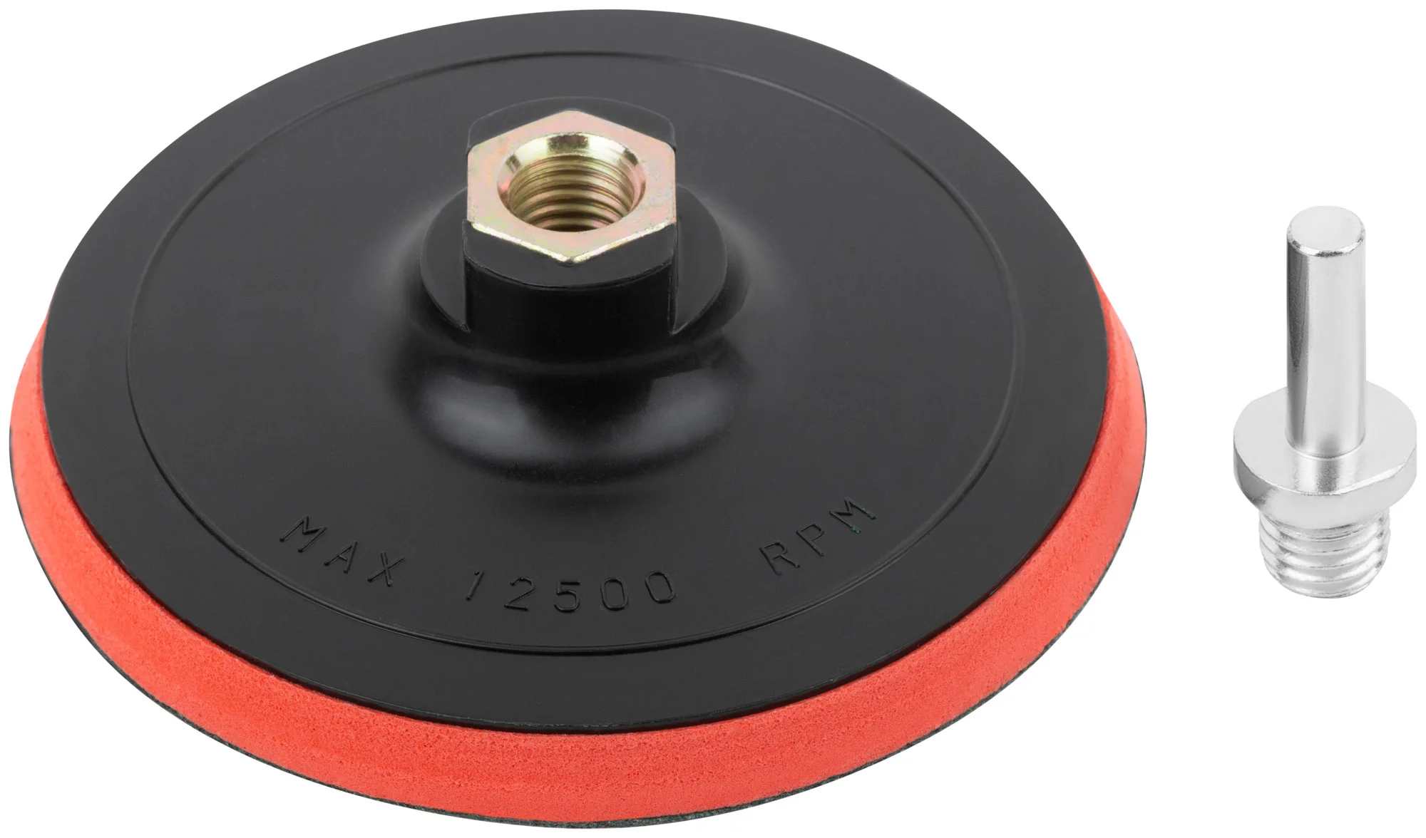 Изготовлен из грубой ткани, диск оснащен гайкой М14 для надежного крепления на угловую шлифовальную машину, а также переходником со штифтом из инструментальной стали, что позволяет использовать его с дрелью. Это делает инструмент универсальным и удобным в применении.