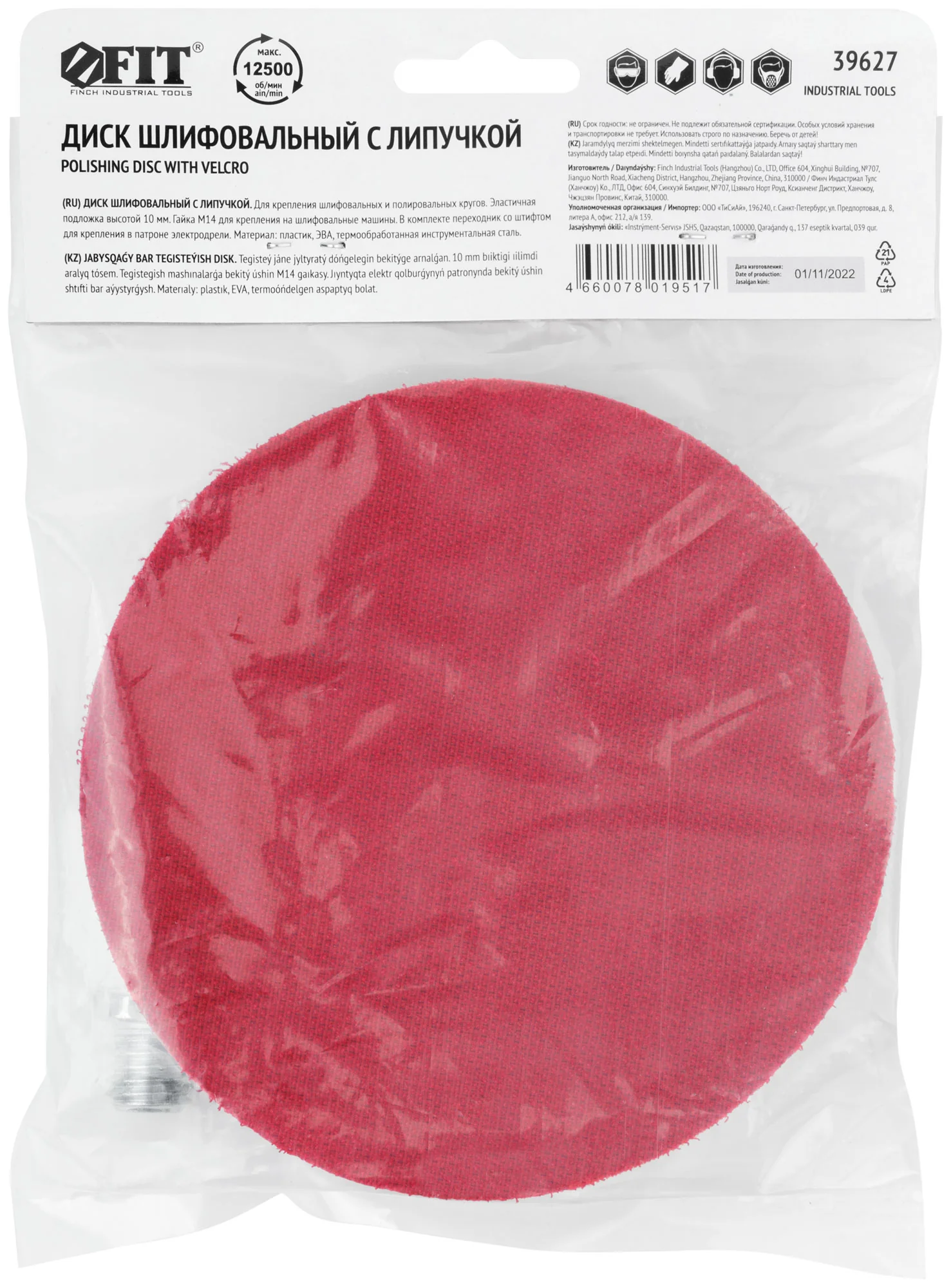 Диск оснащен липучкой и гайкой М14, что делает его совместимым с большинством стандартных шлифовальных и отрезных машин. Дополнительный переходник позволяет использовать диск на дрели, расширяя возможности применения.