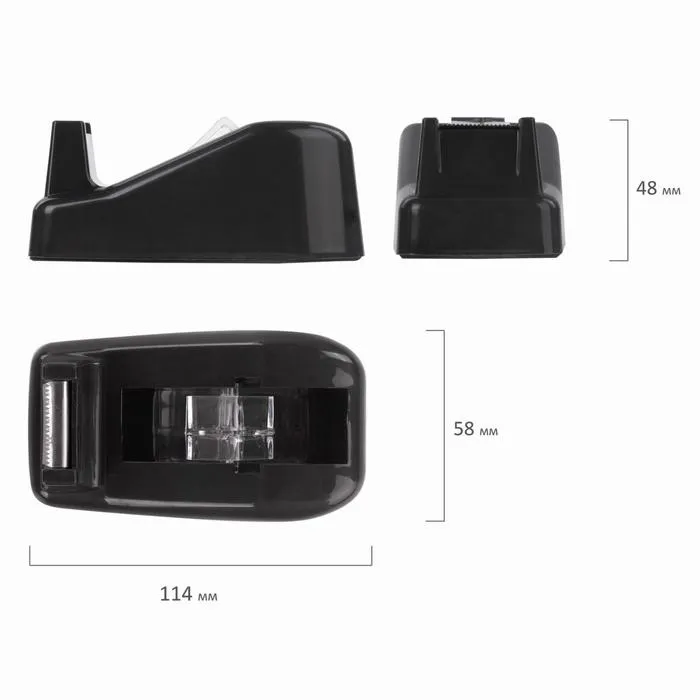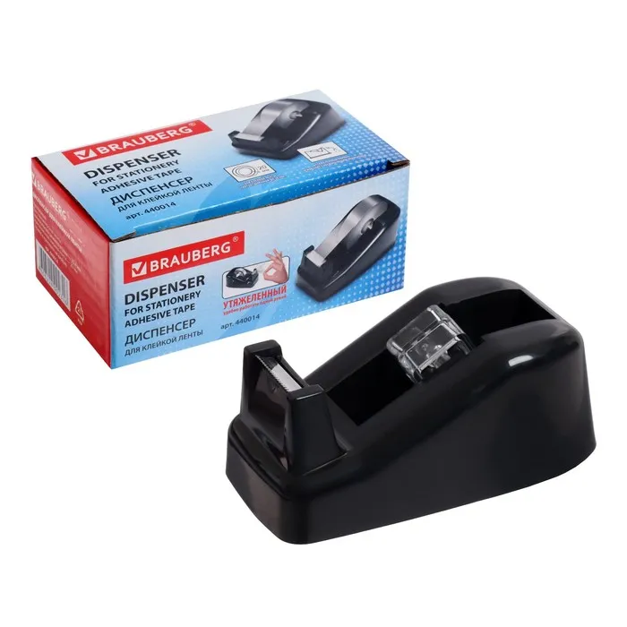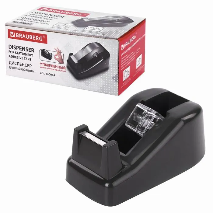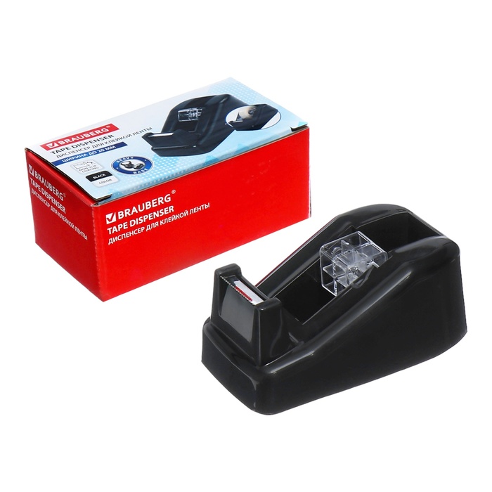 Диспенсер BRAUBERG предназначен для облегчения использования клейкой ленты. Упрощает процесс упаковки предметов, незаменим при большом объеме работ. Может применяться как для офисных, так и бытовых нужд.эталон Диспенсер с настольным типом размещения имеет основание с нескользящим покрытием и утяжелен песком. Изготовлен из ударопрочного пластика. Подходит для ленты шириной до 20 мм (в комплект не входит).