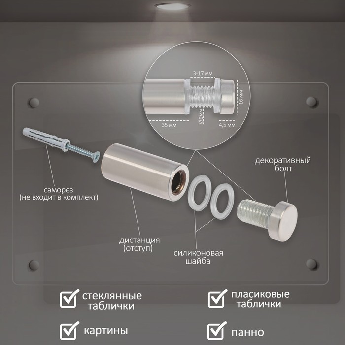 Дистанционный держатель для табличек, 16х40 мм, цвет матовый никель,набор 6 шт. — Характеристики