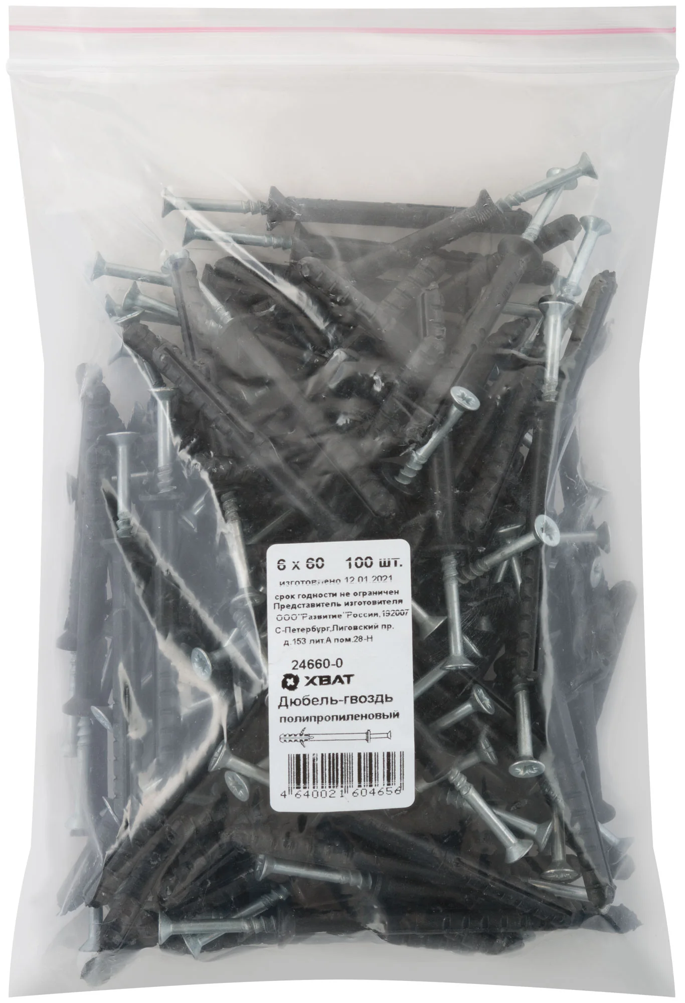 Изготовленный из полипропилена дюбель с потайной манжетой обеспечивает прочное крепление, а оцинкованный или жёлтопассивированный стальной гвоздь гарантирует долговечность соединения. Размер 6х60 мм оптимален для многих бытовых и профессиональных задач.