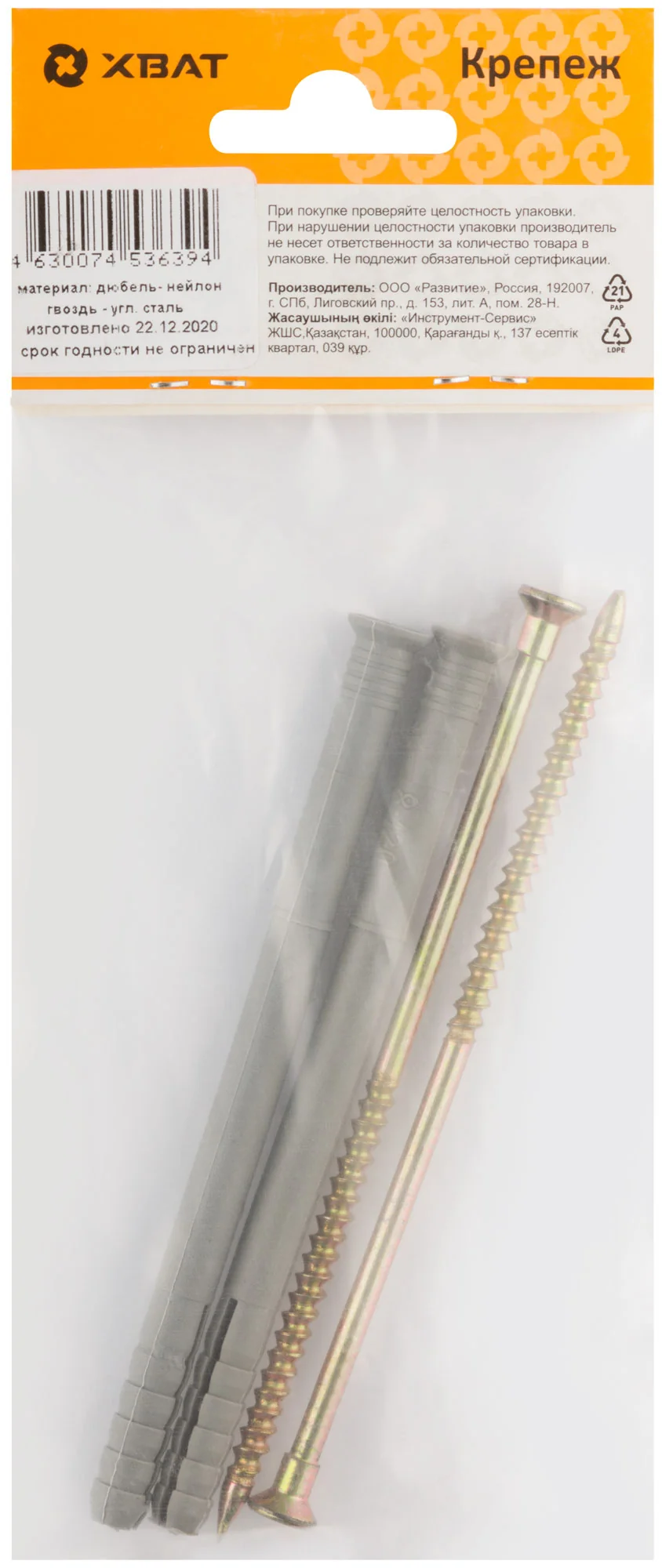 Дюбель изготовлен из полипропилена, что обеспечивает его долговечность и устойчивость к внешним воздействиям. Шуруп выполнен из стали с гальваническим цинковым покрытием для защиты от коррозии. Компактная фасовка в 2 штуки позволяет удобно использовать продукт в небольших проектах.