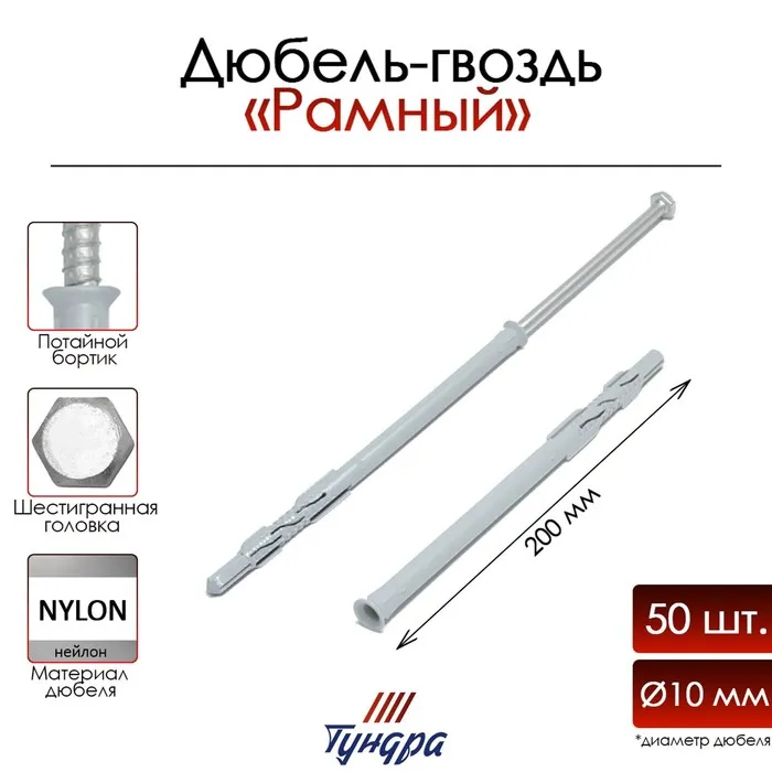 Дюбель-гвоздь ТУНДРА, потайной бортик, нейлоновый, 8×100 мм, 50 шт. — Характеристики