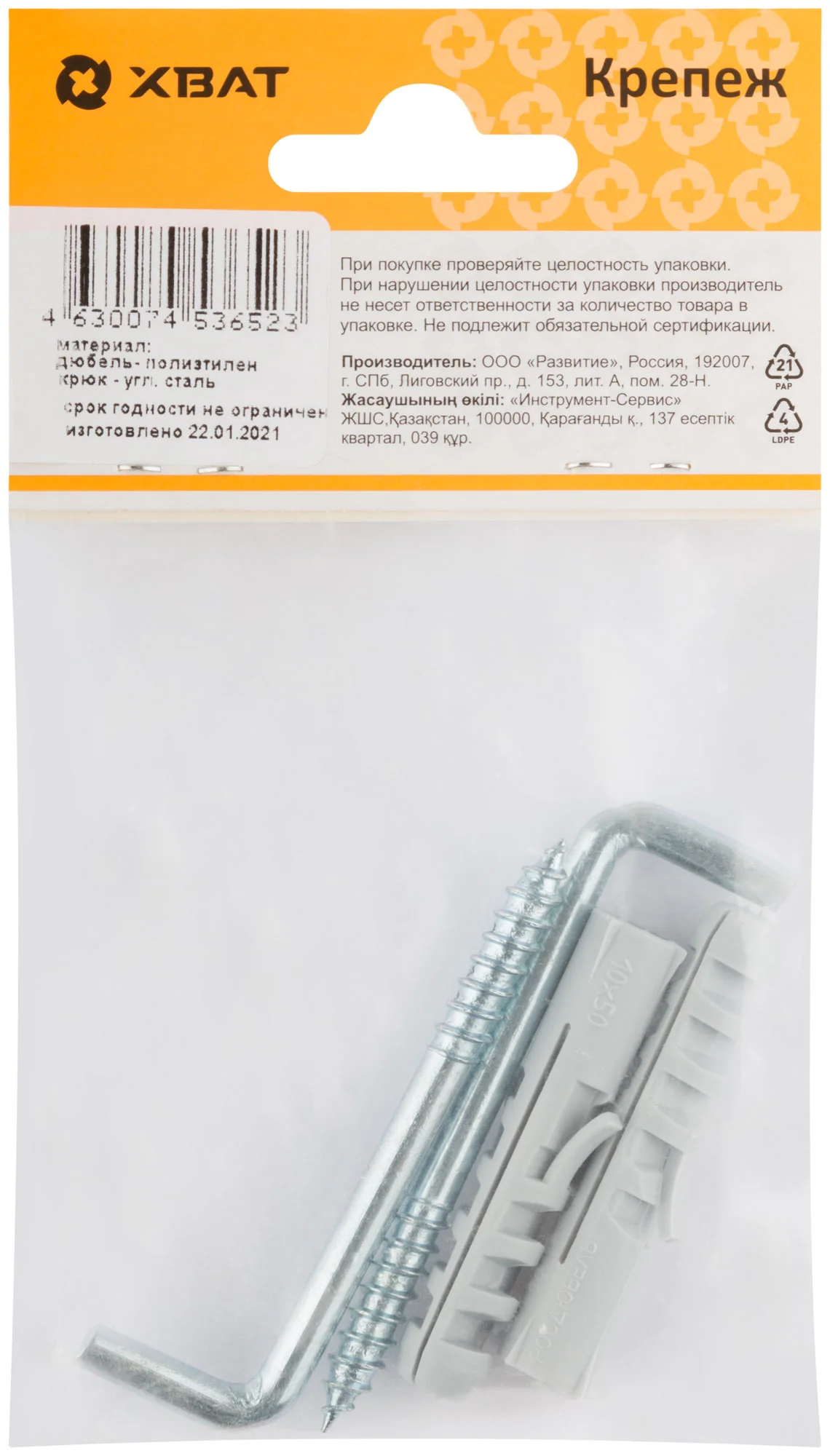 Дюбель изготовлен из прочного полипропилена, а крюк выполнен из стали, что обеспечивает долговечность и надежность крепления. Комплект включает дюбель и шуруп-крюк, что делает его удобным для немедленного использования без необходимости подбора дополнительных крепежных элементов.