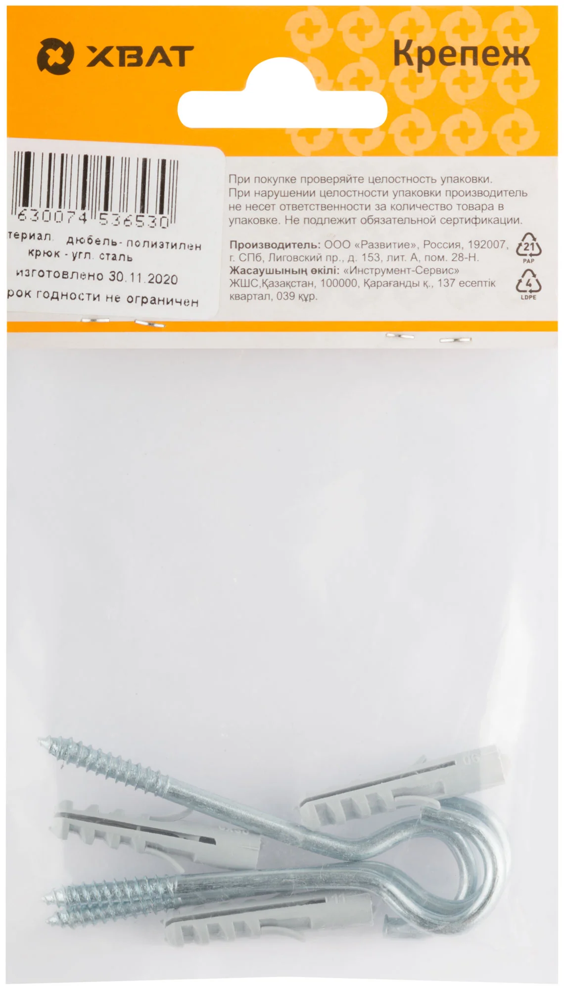 Дюбель изготовлен из прочного полипропилена, что обеспечивает надежное сцепление со стеной. Шуруп-полукольцо выполнено из стали, что гарантирует долгий срок службы и устойчивость к нагрузкам.