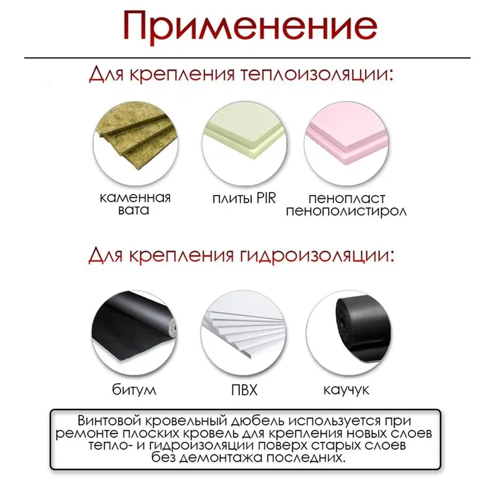 Дюбель "ТУНДРА krep" используется при ремонте плоских кровель для крепления новых слоев тепло- и гидроизоляции поверх старых слоев без демонтажа последних.