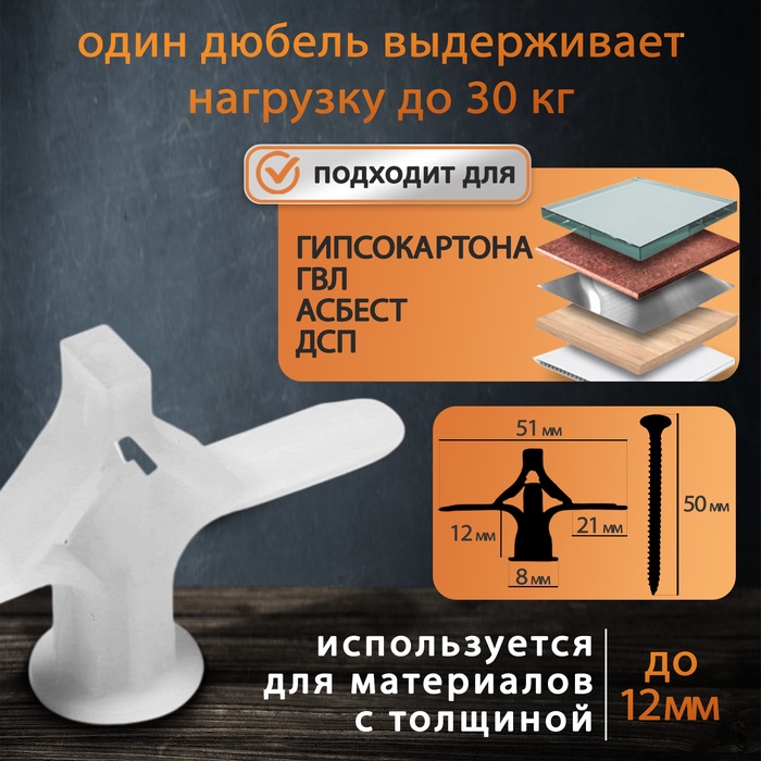 Дюбель ТУНДРА, тип Бабочка 30×50, с шурупом, белый, 25 шт. — Характеристики