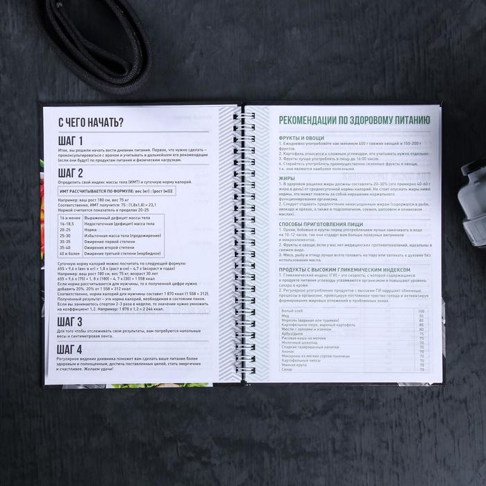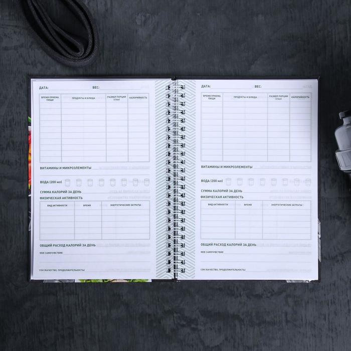Дневник питания – это идеальный блокнот для тех, кто стремится вести здоровый образ жизни и контролировать свое питание. С помощью такого дневника вы сможете отслеживать свои успехи на пути к здоровому питанию. В этом блокноте предусмотрено всё необходимое для контроля над своим рационом. Записывайте все, что вы съели в течение дня, и анализируйте полученные данные. Подводите итоги каждой недели, чтобы оценить свой прогресс и при необходимости внести коррективы в рацион.
