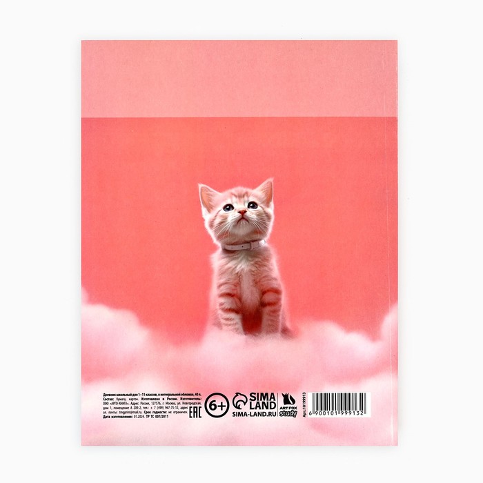 Дневник школьный для 1-11 класса, в интегральной обложке, 40 л. «Котик на облаке» — Характеристики