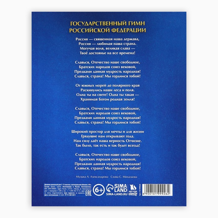 Дневник школьный для 1-11 класса, в интегральной обложке, 40 л. «Россия. Синий» — Характеристики