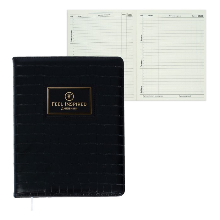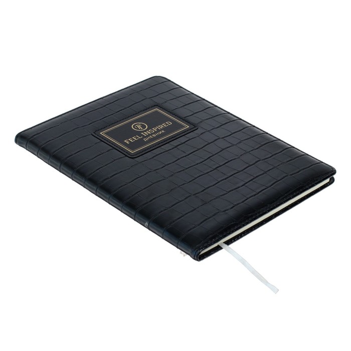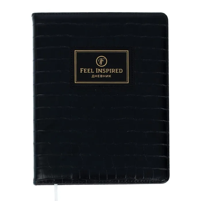 Дневник deVENTE. Feel Inspired, черная обложка, универсальный блок, офсет 1 краска, кремовая бумага 80 г/м2, твердая обложка из искусственной кожи с поролоном, аппликация из искусственной кожи, тиснение фольгой, отстрочка, 1 ляссе.