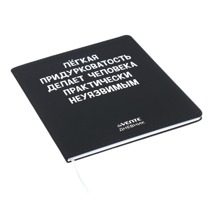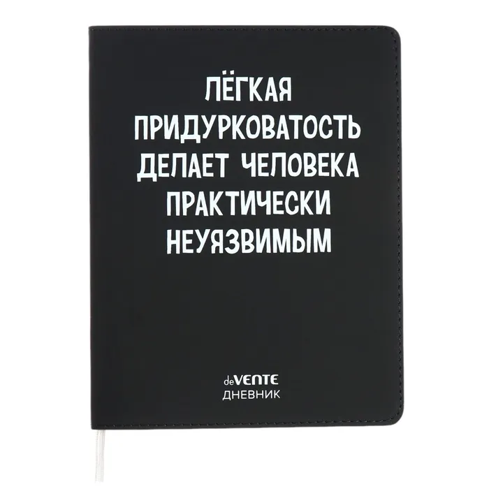 Дневник "deVENTE. Легкая придурковатость делает человека неуязвимым" универсальный блок, 48 листов, белая бумага 80 г/м², печать в 1 краску, гибкая обложка из искусственной кожи, шелкография, отстрочка, 1 ляссе