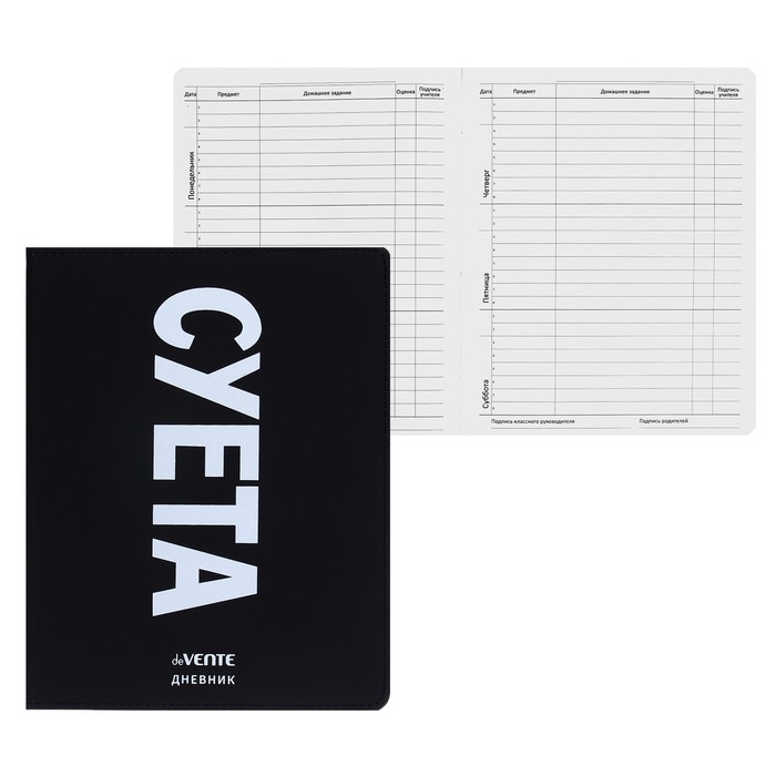 Дневник "deVENTE. Суета" универсальный блок, 48 листов, белая бумага 80 г/м², печать в 1 краску, гибкая обложка из искусственной кожи, шелкография, отстрочка, 1 ляссе