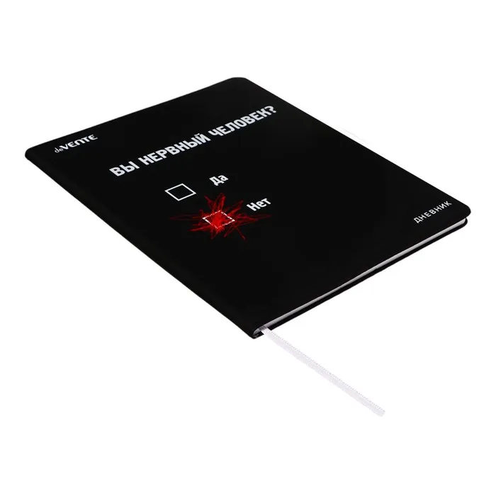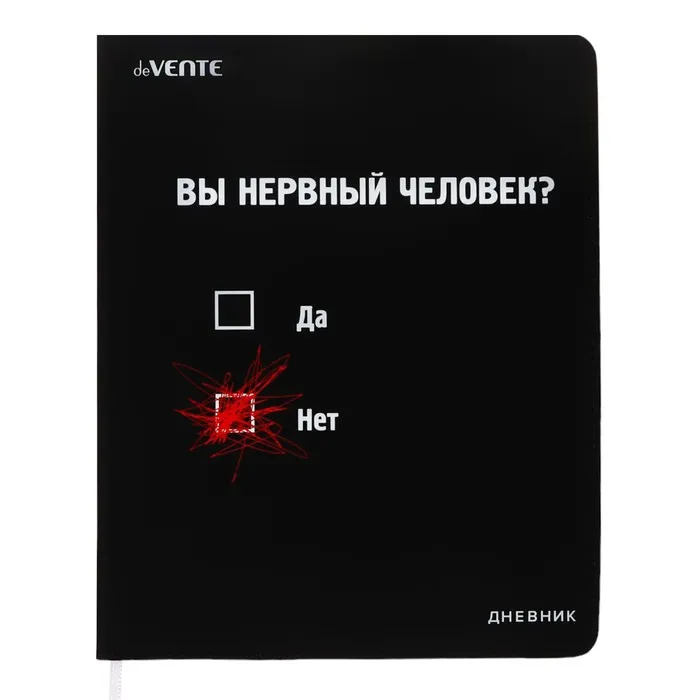Дневник "deVENTE. Вы нервный человек?" универсальный блок, 48 листов, белая бумага 80 г/м², печать в 1 краску, гибкая обложка из искусственной кожи, шелкография, отстрочка, 1 ляссе.