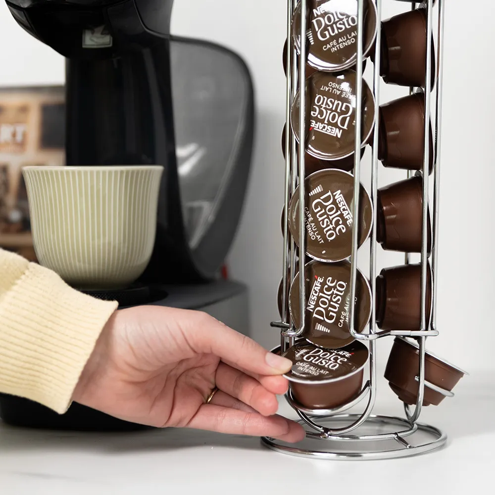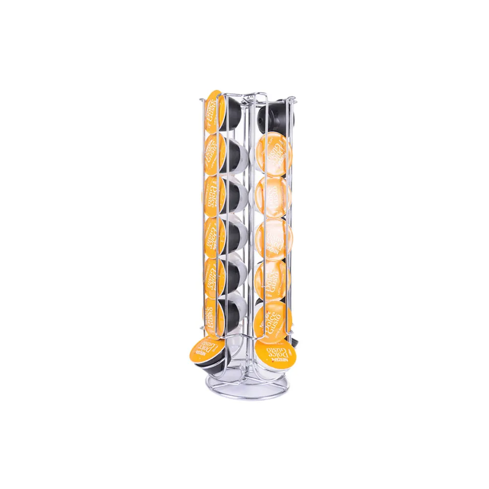 Подставка для капсул, вмещающая до 24 капсул, изготовлена из качественного железа с хромированным покрытием. Компактный дизайн экономит место, а стильный внешний вид подходит для любого интерьера.